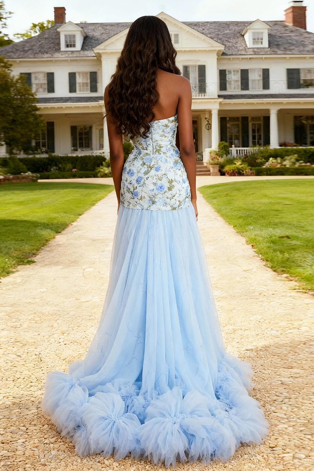 Strapless A Line Ruffled Sky Blue Prom Dress with Appliques