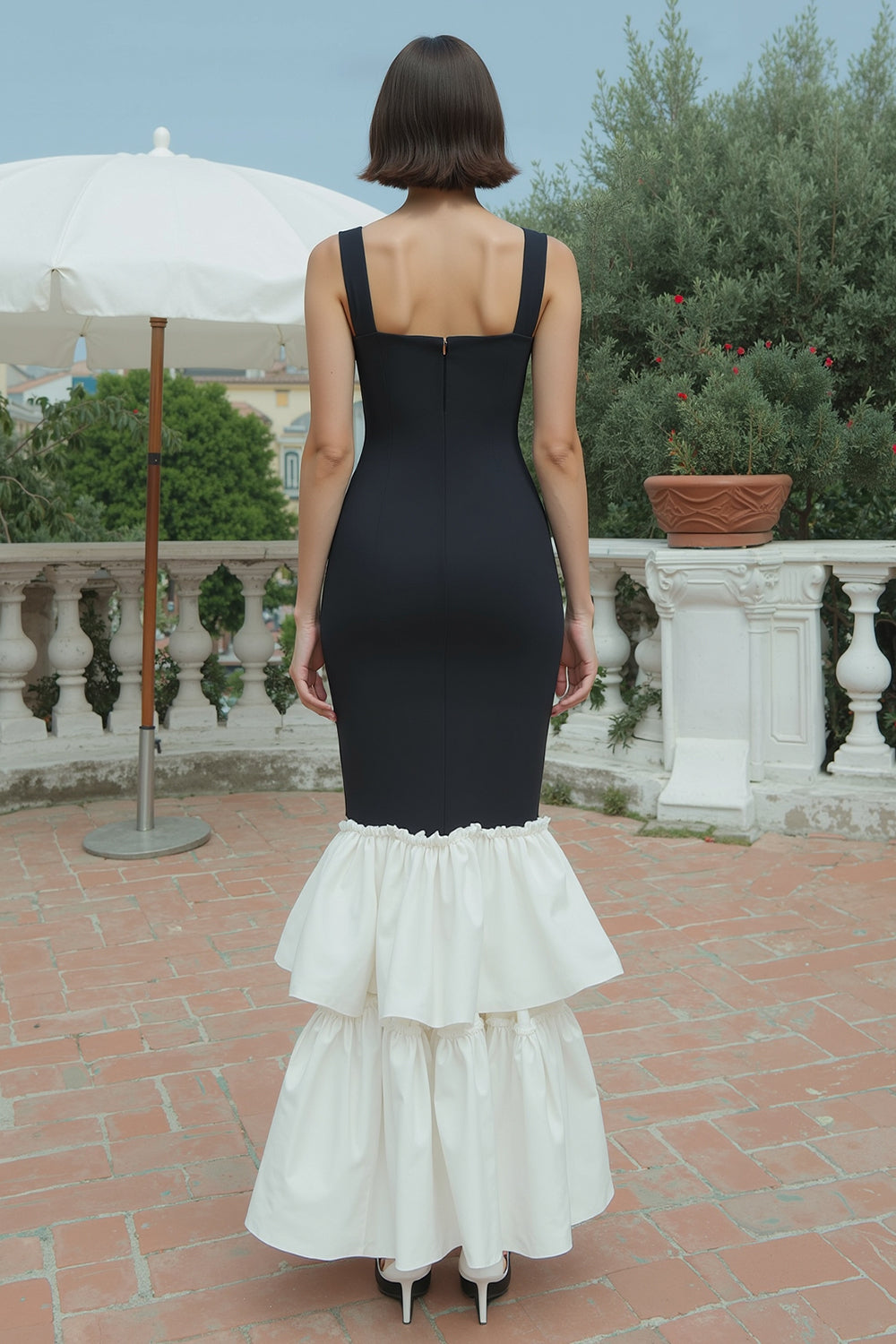 Square Neck Ruffled Black and White Mermaid Formal Dress