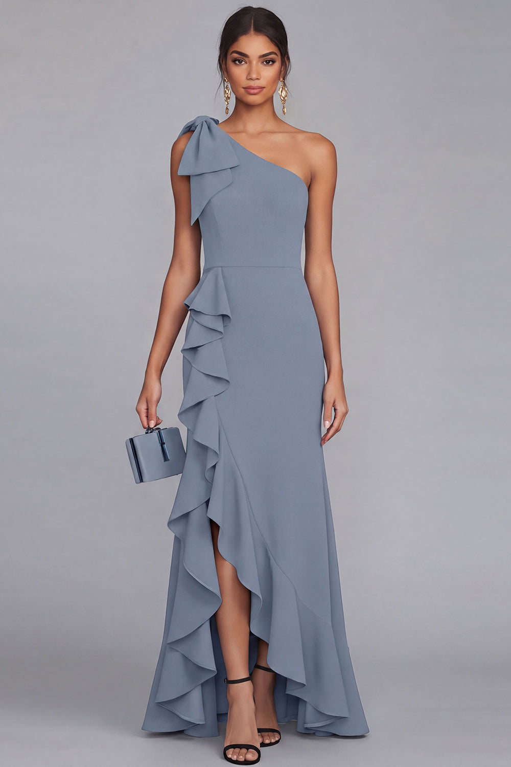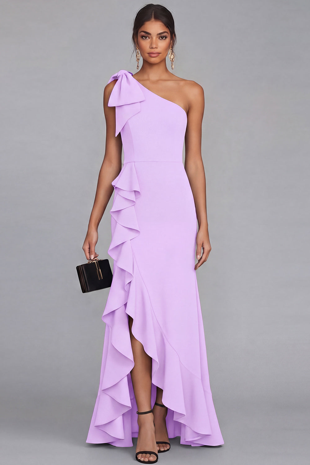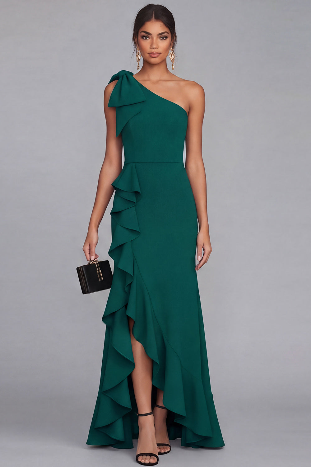 One Shoulder Black Bow Ruffle Evening Dress with Slit