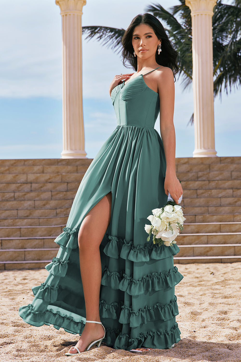 A-Line Spaghetti Straps Corset Long Ruffled Eucalyptus Bridesmaid Dress with Slit