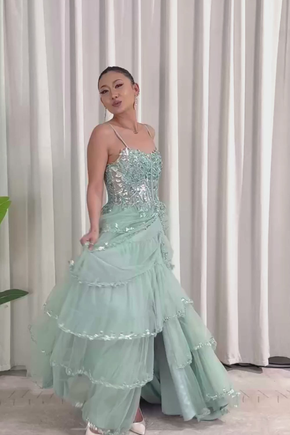Sparkly Sage Green A Line Strapless Tiered Sequins Corset Prom Dress