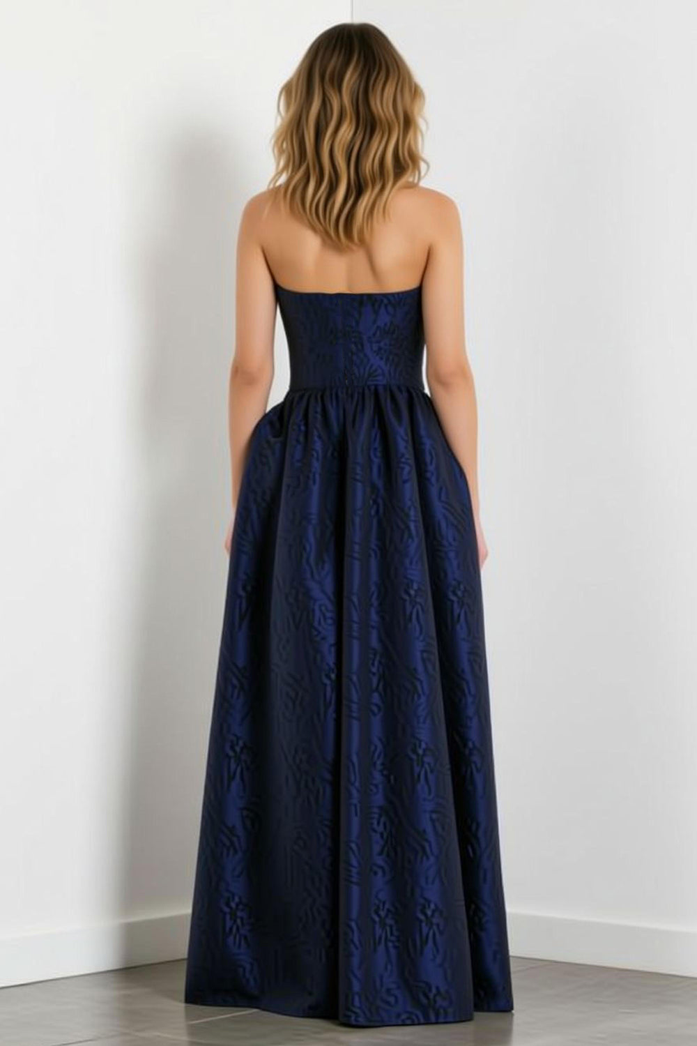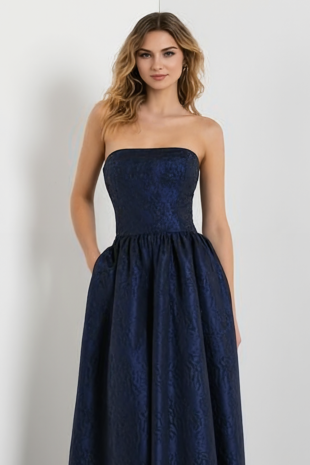 Navy A-Line Strapless Long Jacquard Dress with Pockets