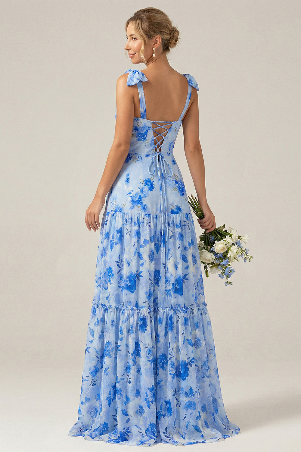 A Line Blue Floral Long Bridesmaid Dress With Bows