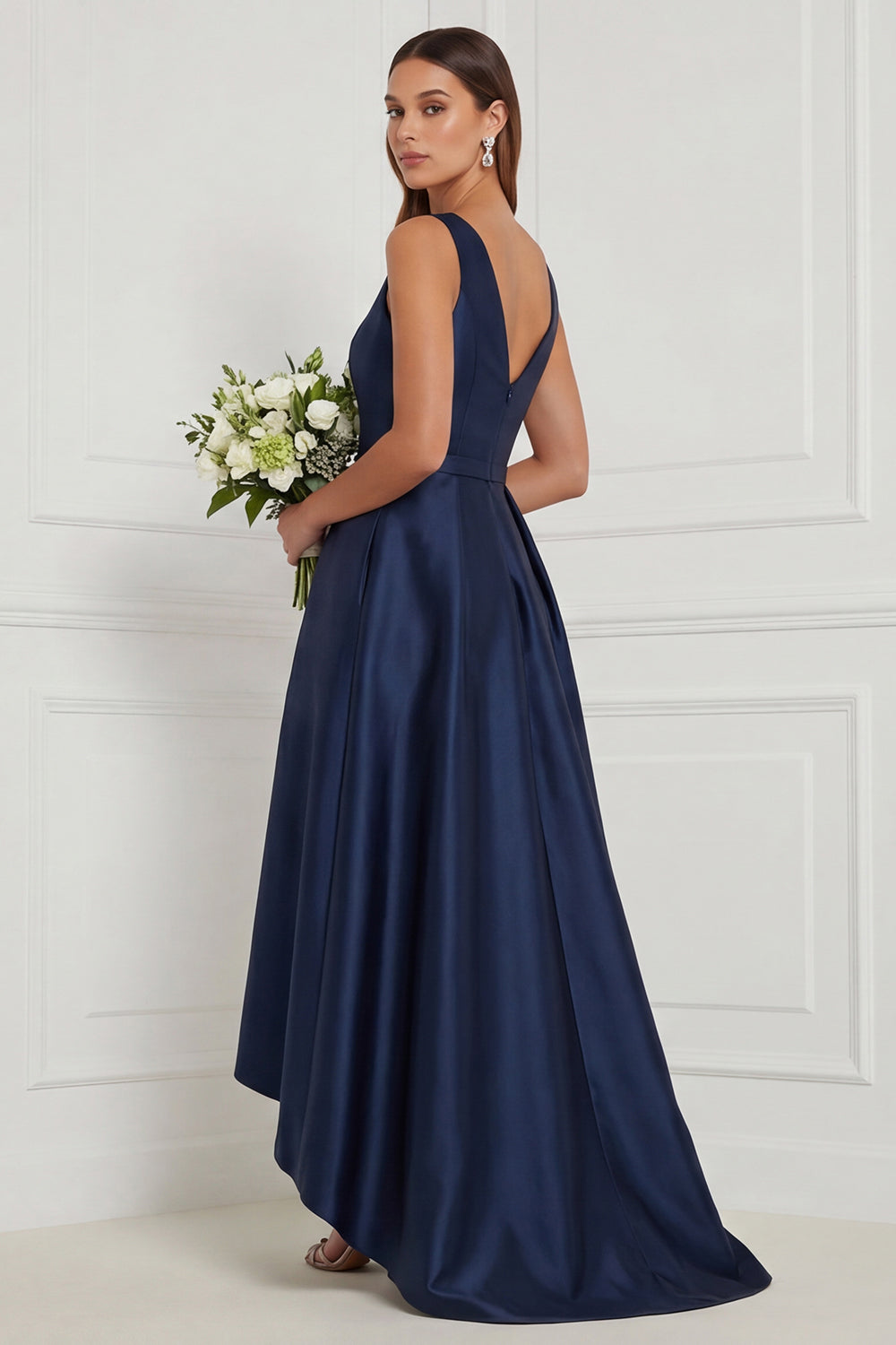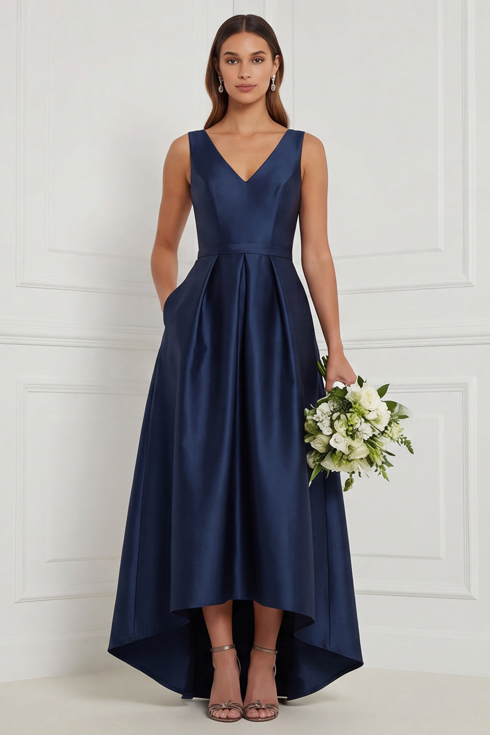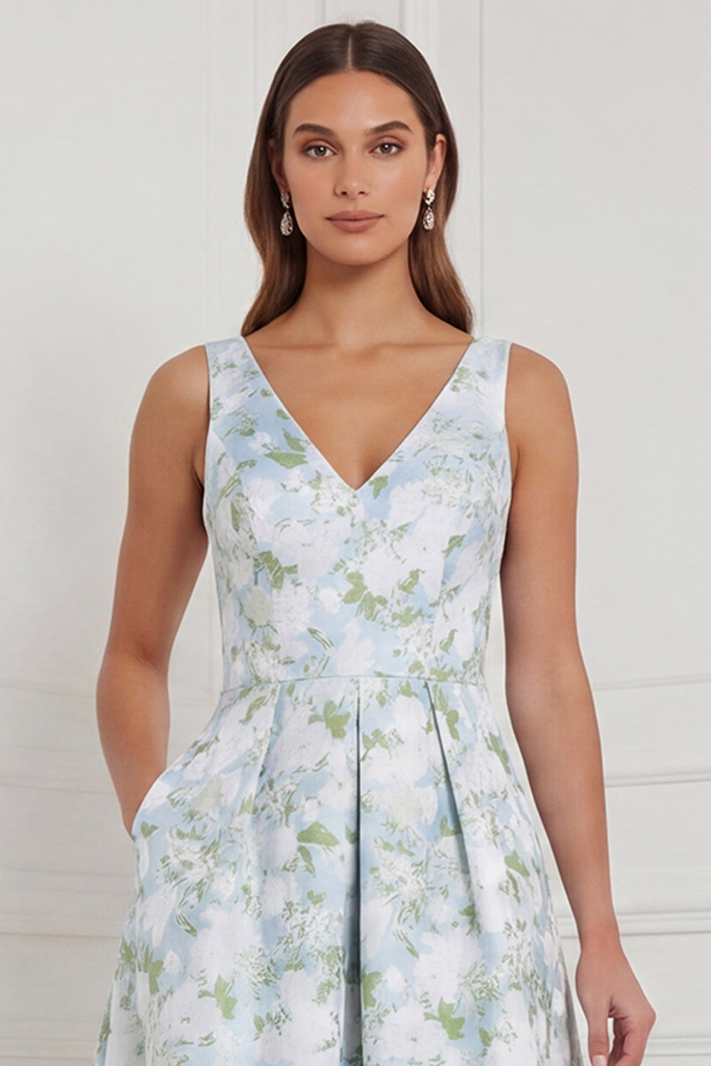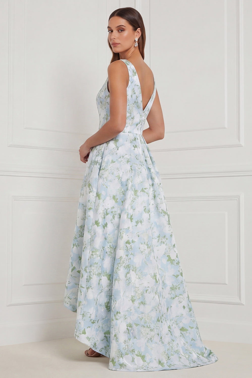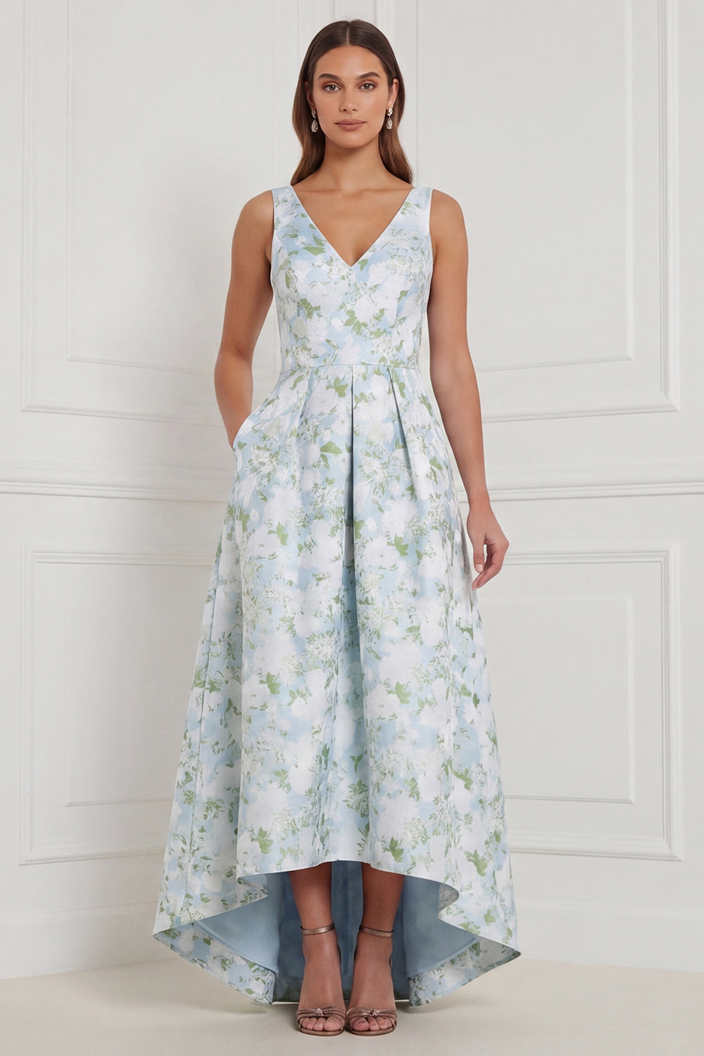A Line Blue White Flower V-Neck High-Low Bridesmaid Dress