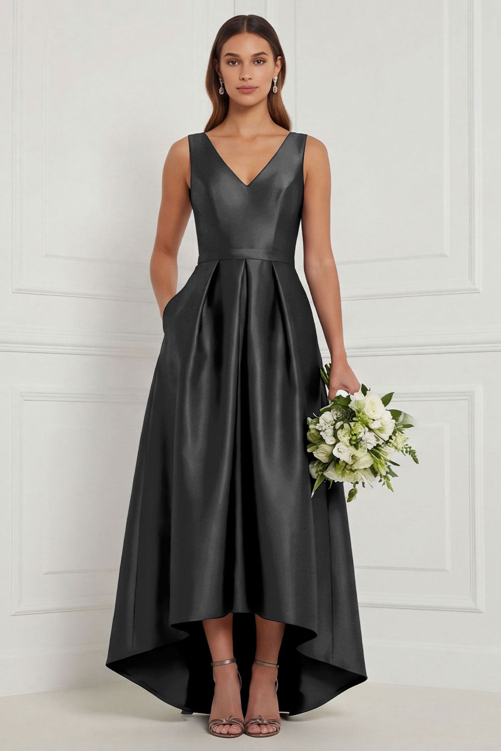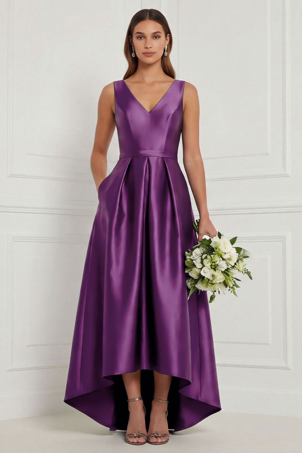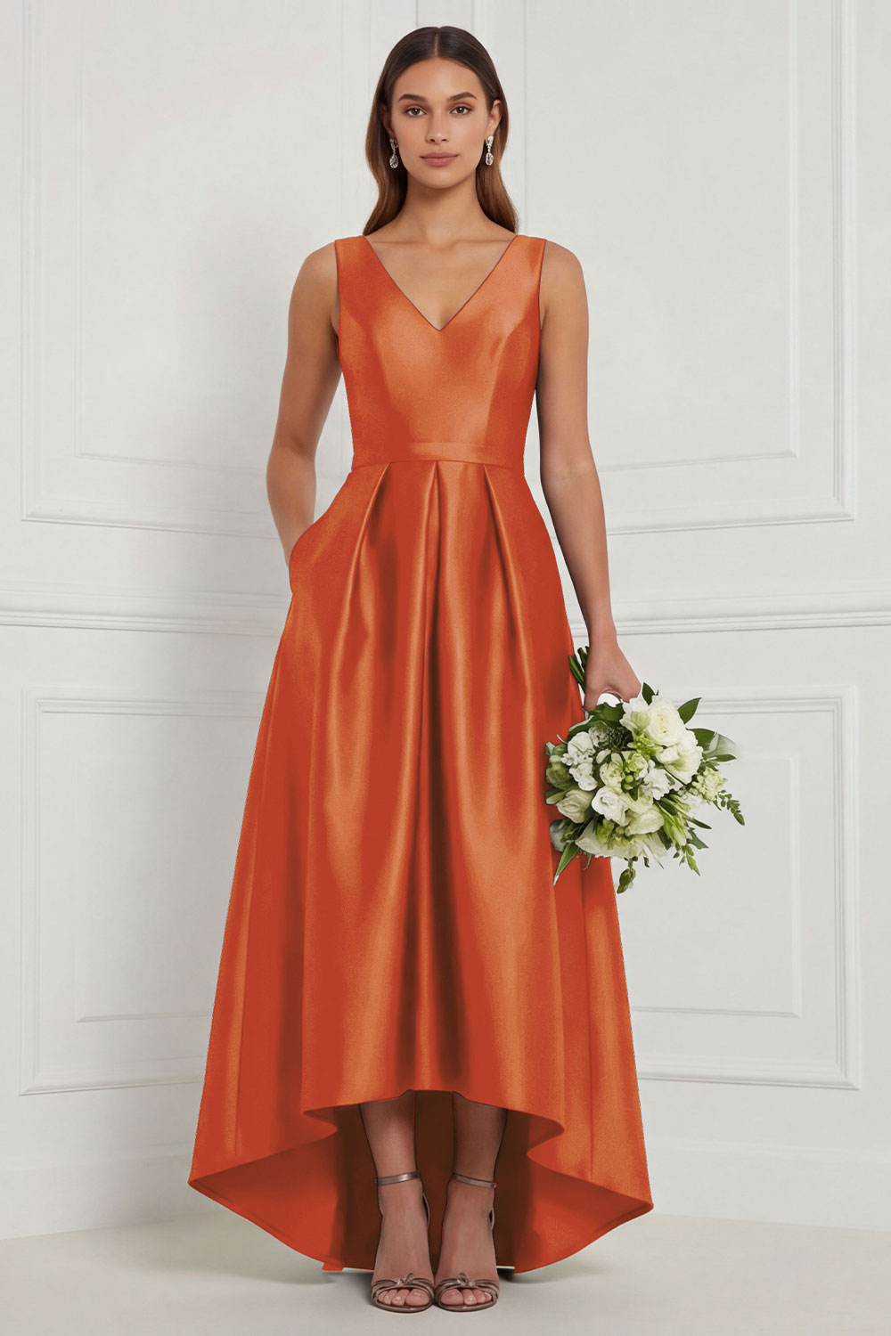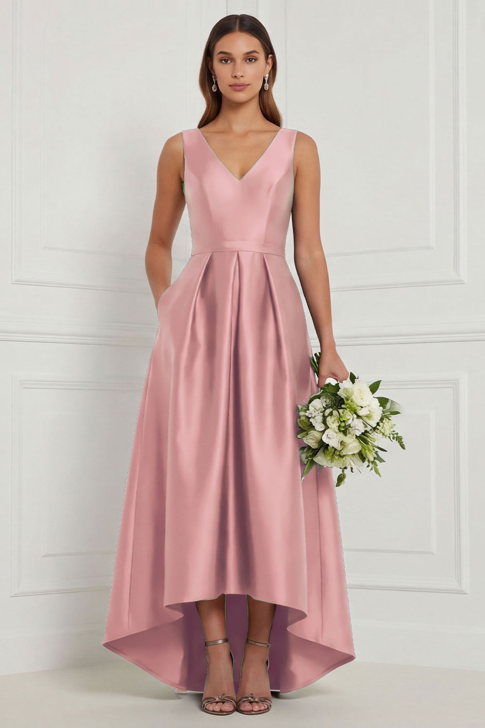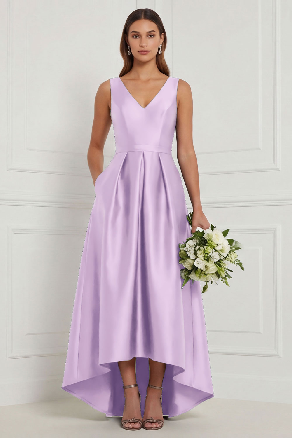 A Line Blue White Flower V-Neck High-Low Bridesmaid Dress