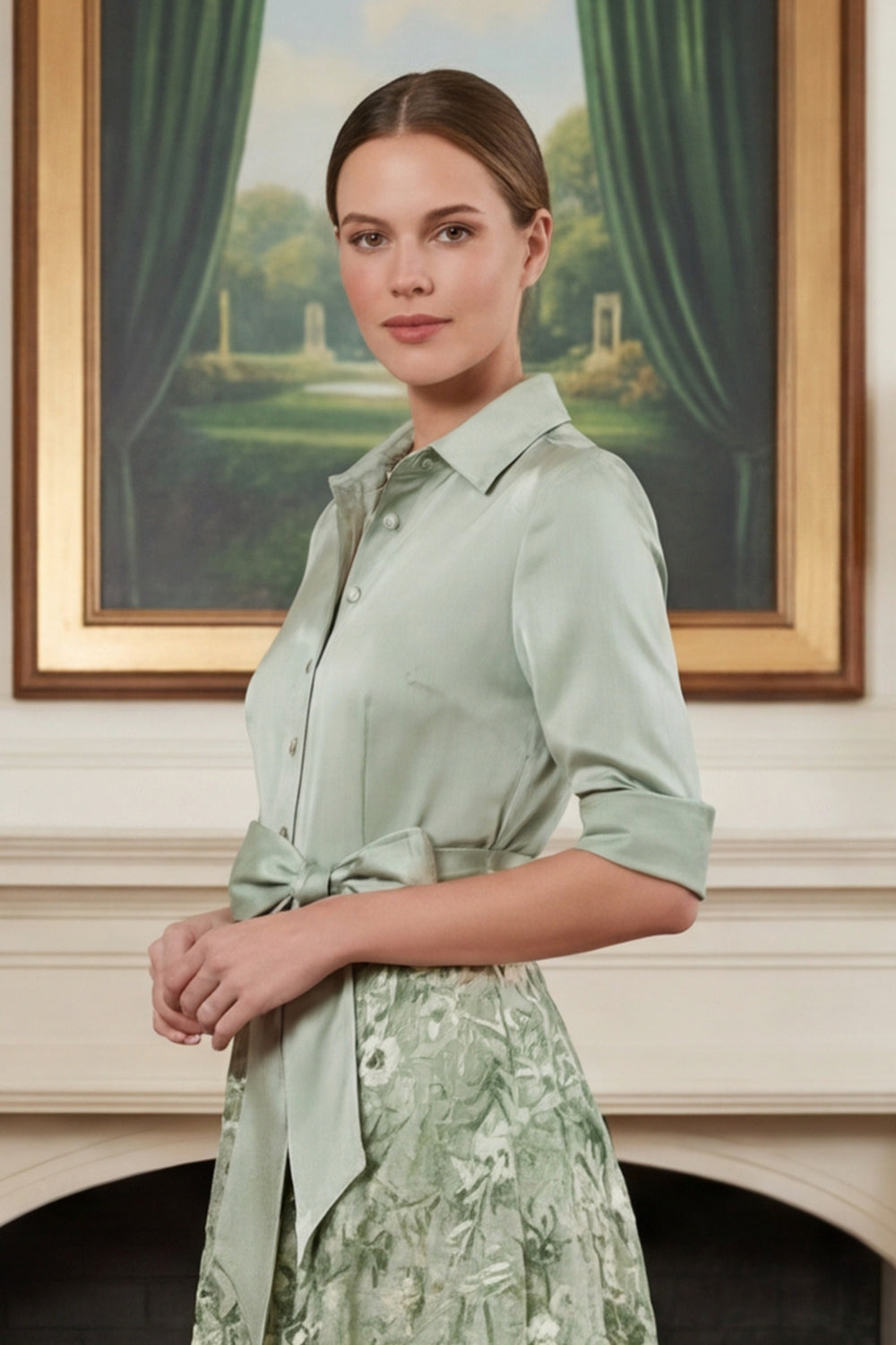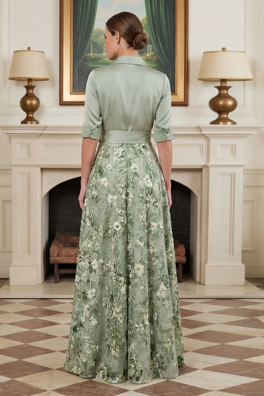 A Line Sage Green Floral Notched Lapel Long Mother Of The Bride Dress with Bow