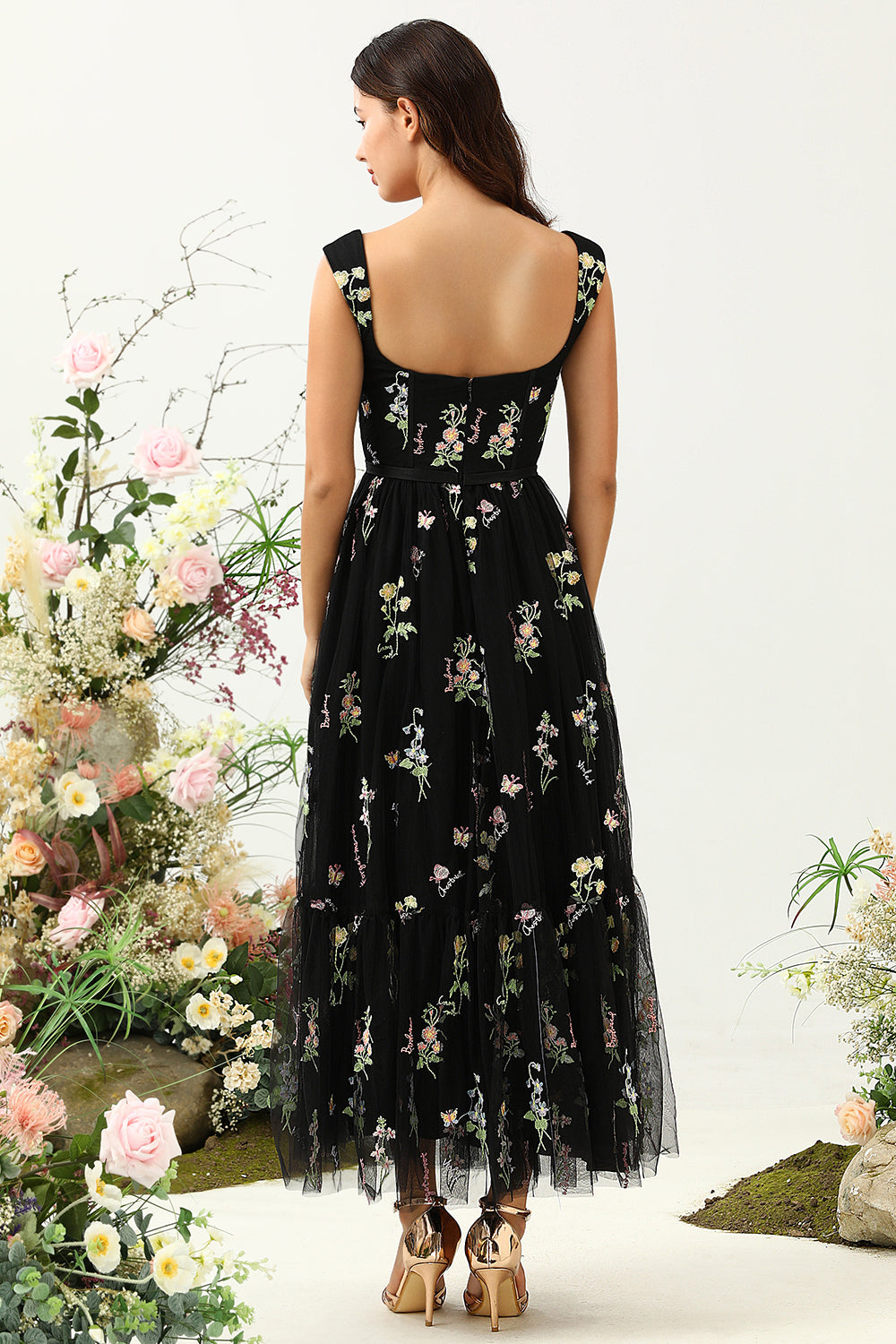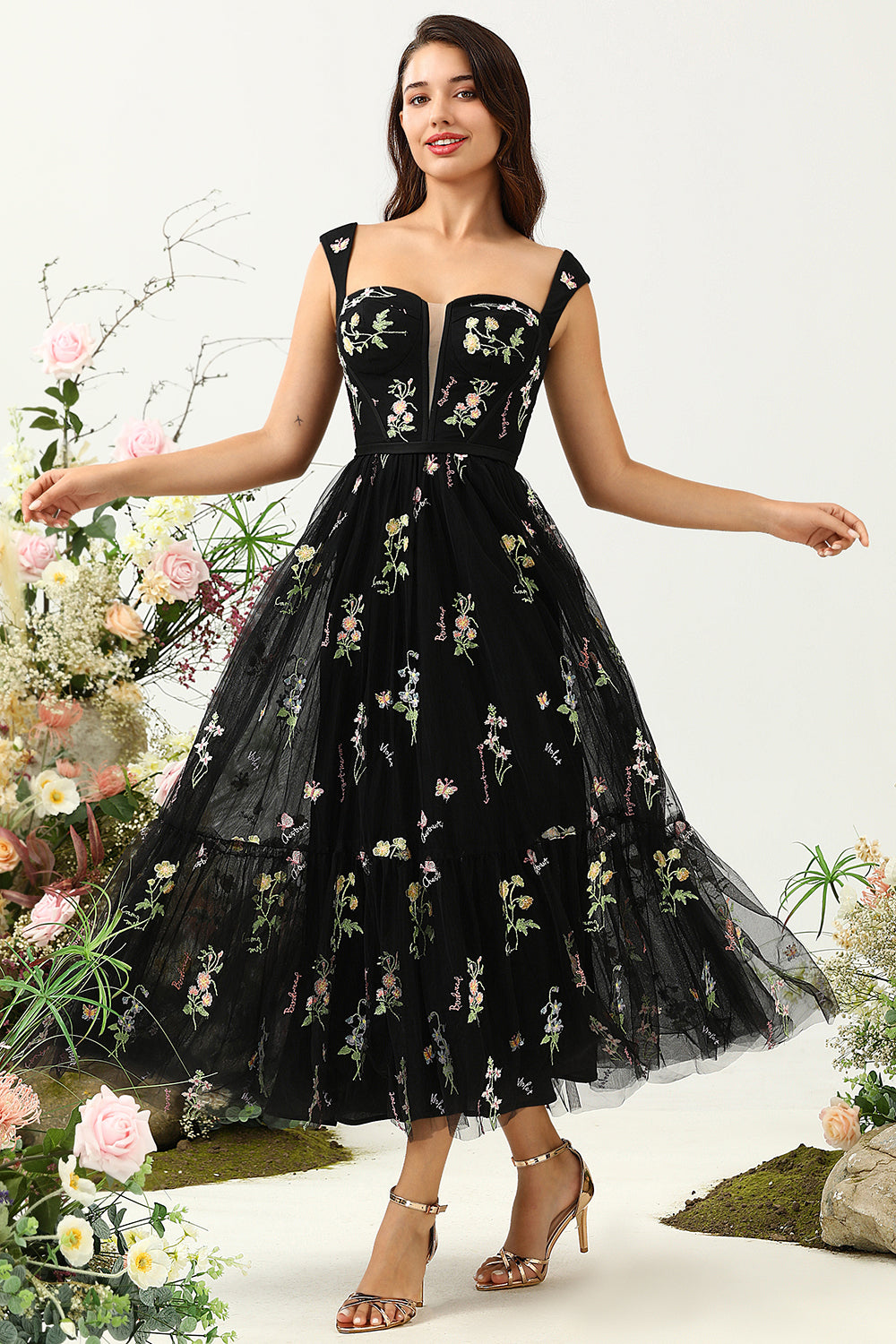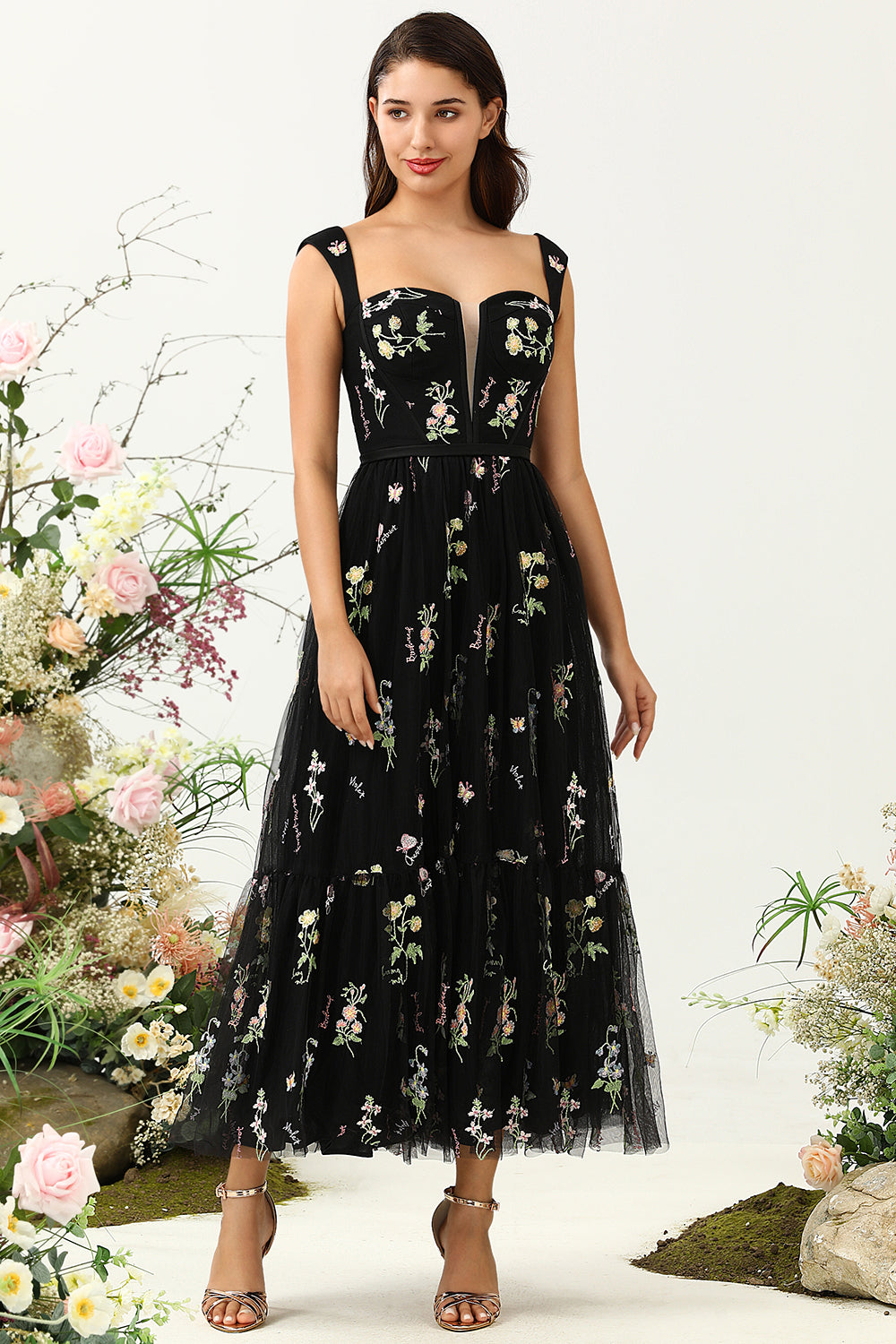 Black A Line Embroidered Sweetheart Tea Length Wedding Party Dress