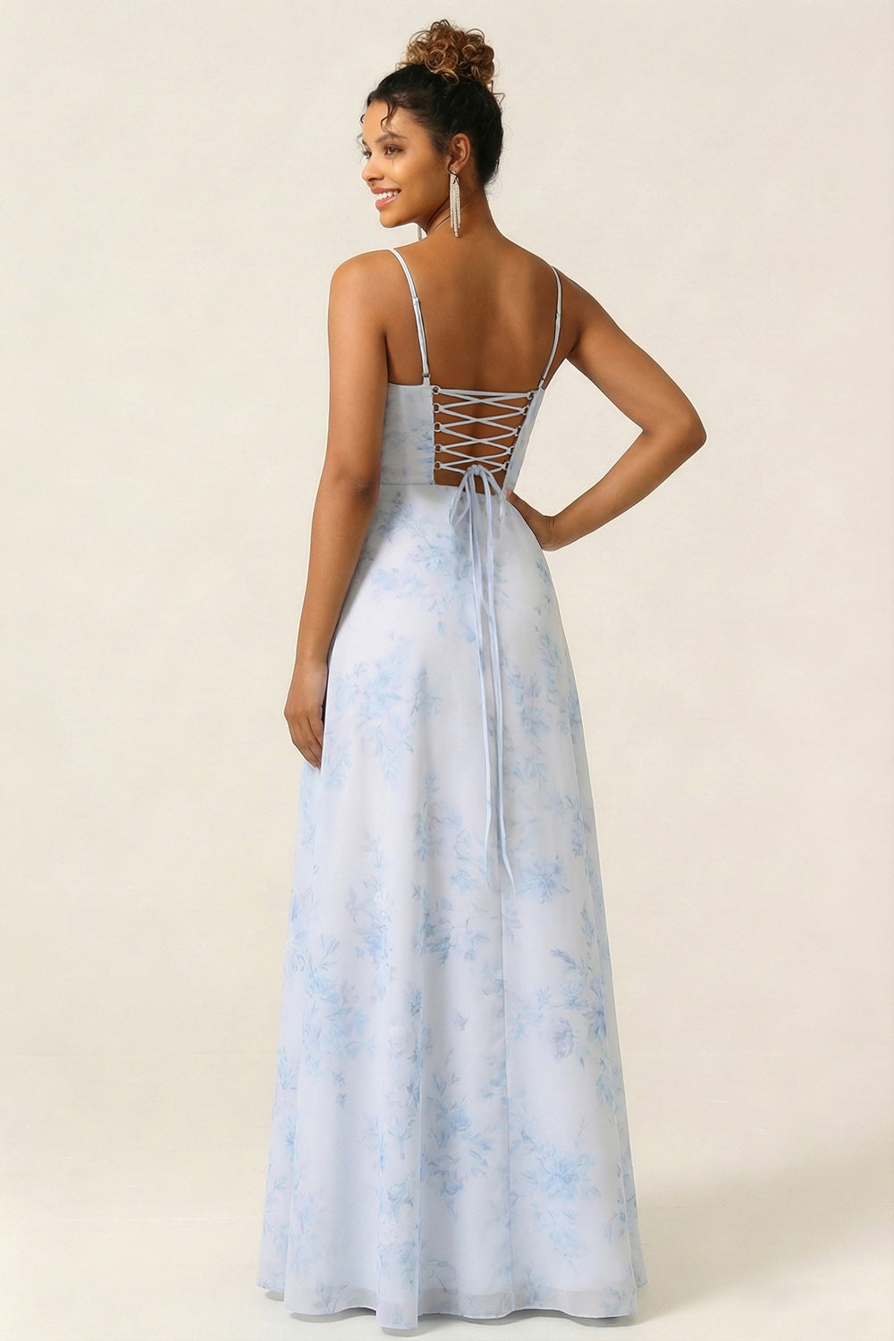 Blue Floral A Line Spaghetti Straps Long Bridesmaid Dress With Slit