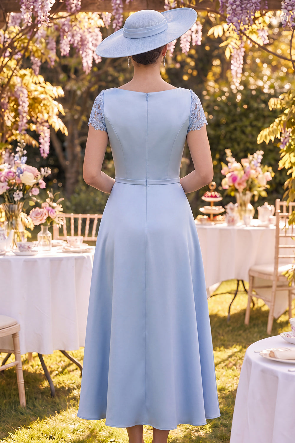 Blue Lace Sheath Mum of the Bride Dress with Side Streamer