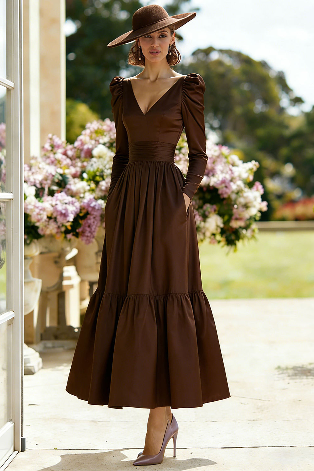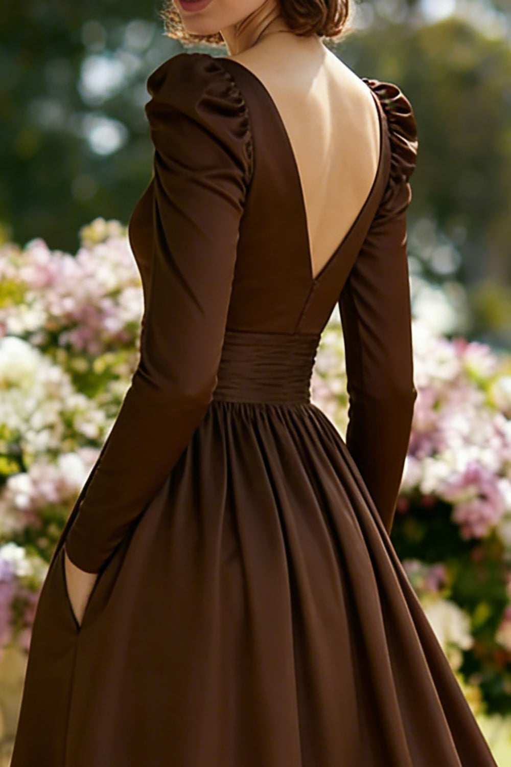 Brown V-Neck A Line Mother of the Bride Dress with Long Sleeves