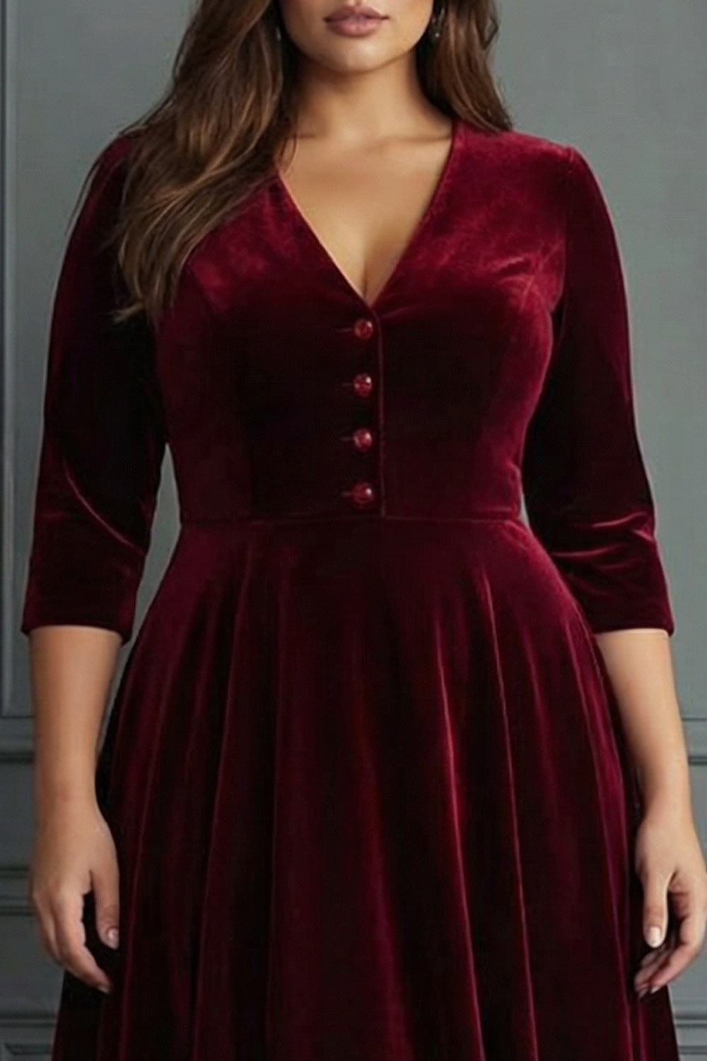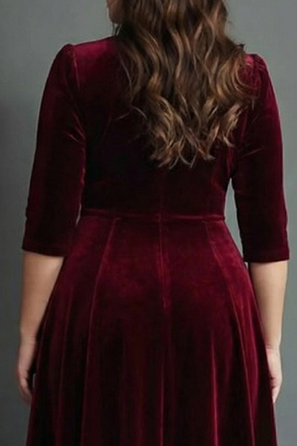 Burgundy A Line Velvet V-Neck Plus Size Midi Formal Dress with Sleeves
