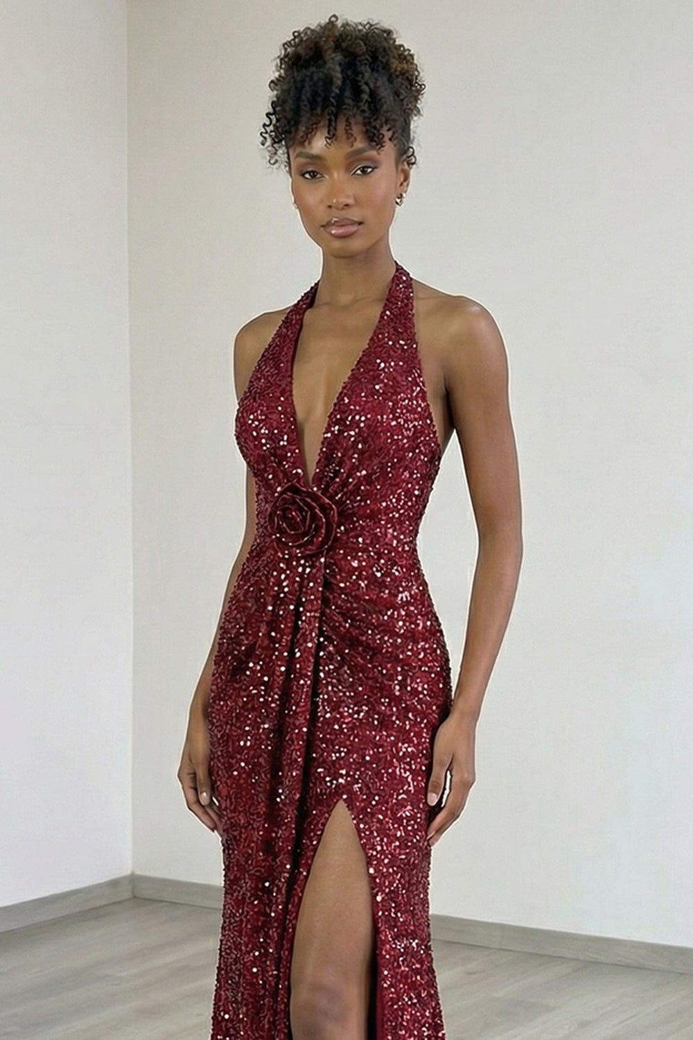 Burgundy Halter 3D Flower Sparkly Mermaid Prom Dress With Slit