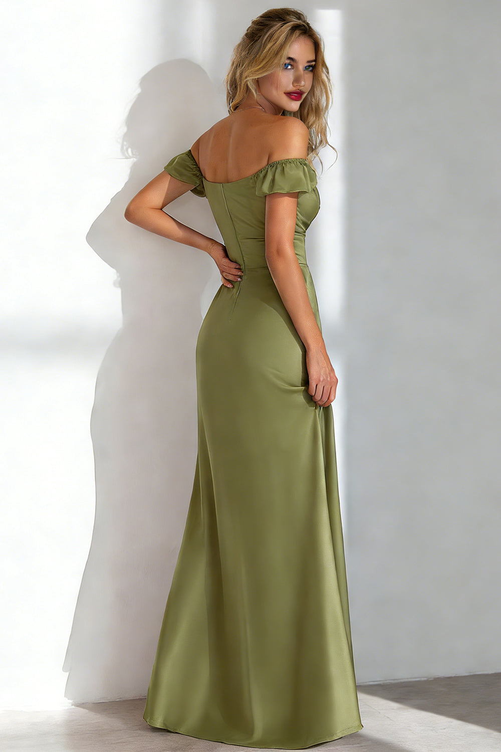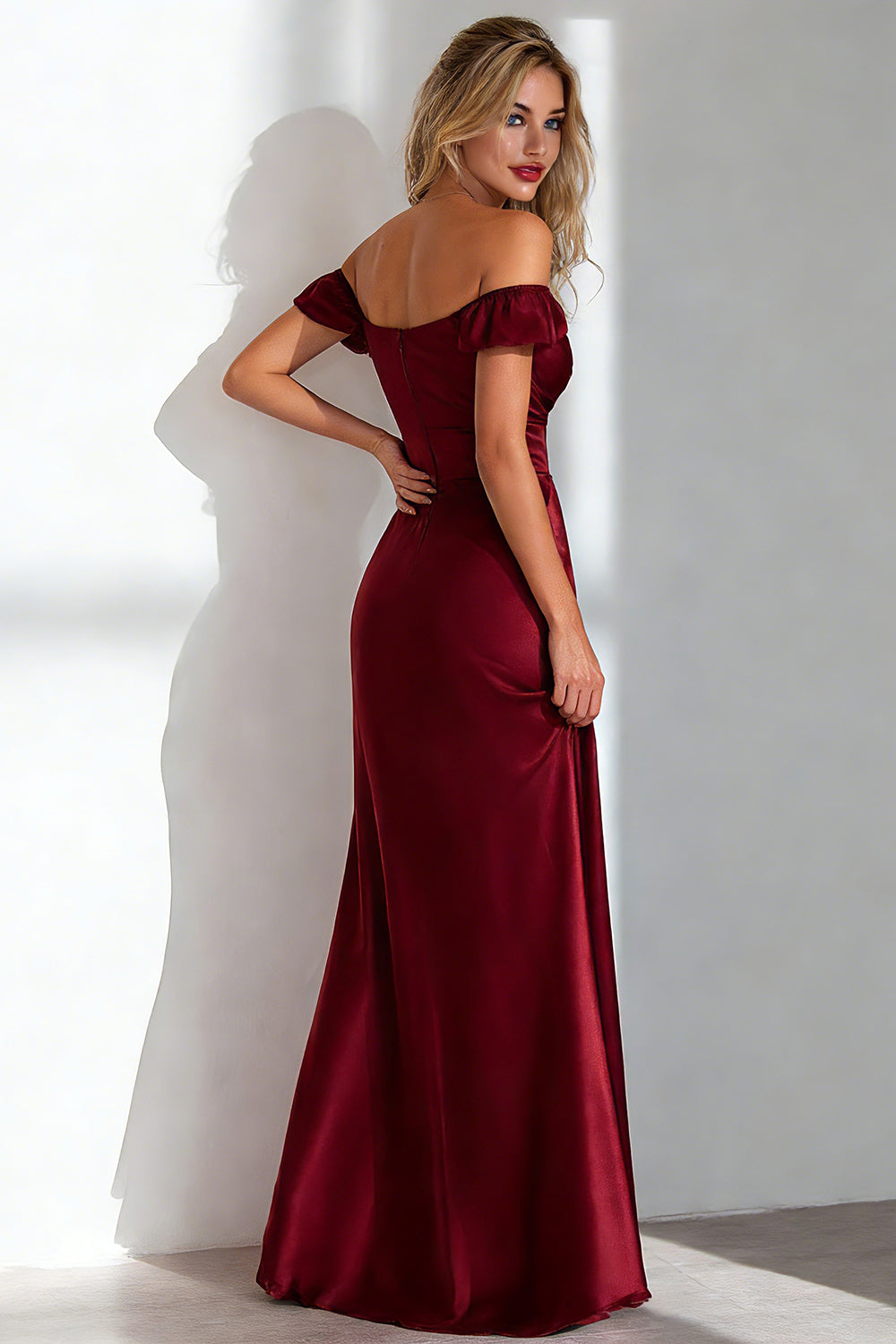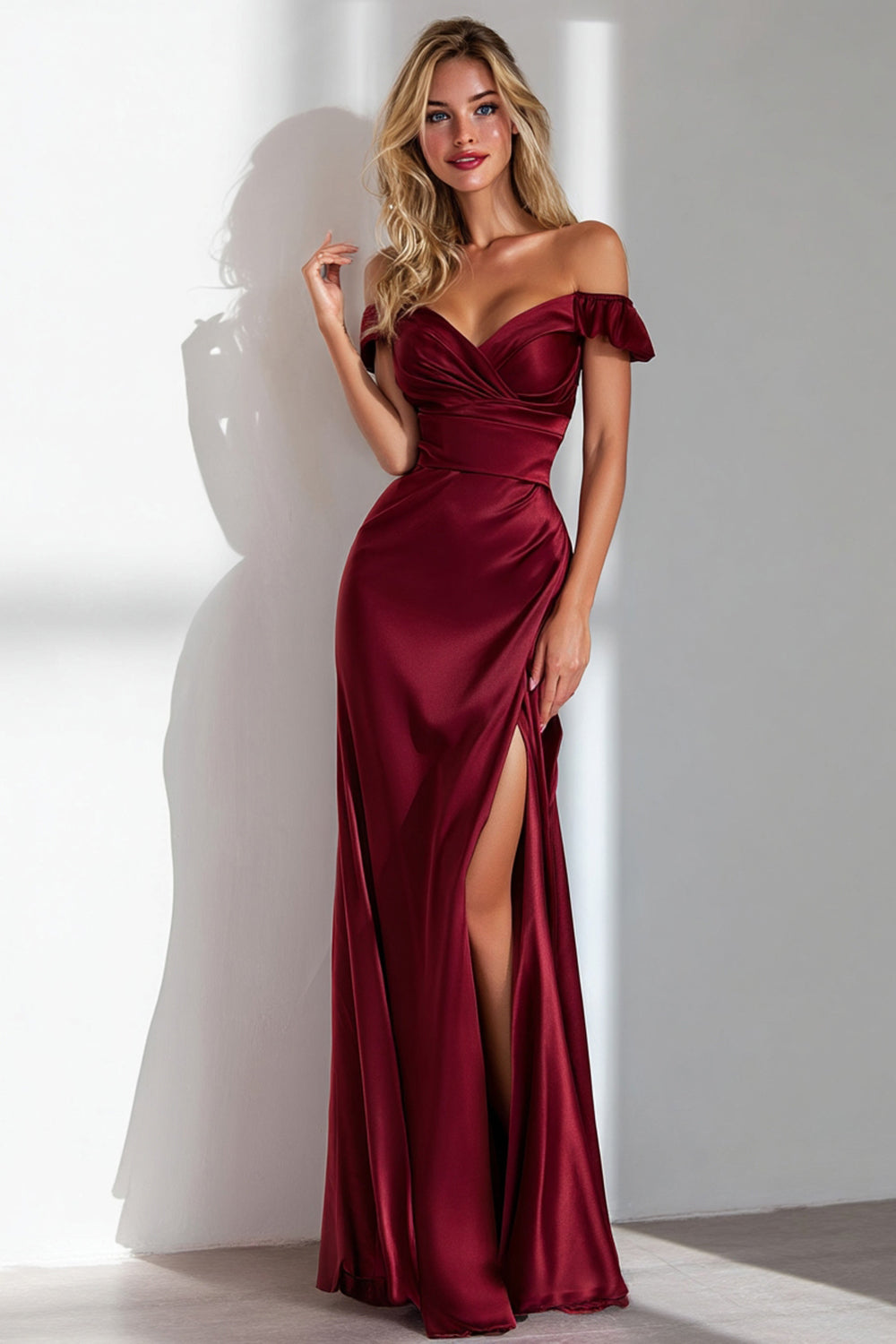 Burgundy Sheath Off the Shoulder Long Formal Dress With Slit