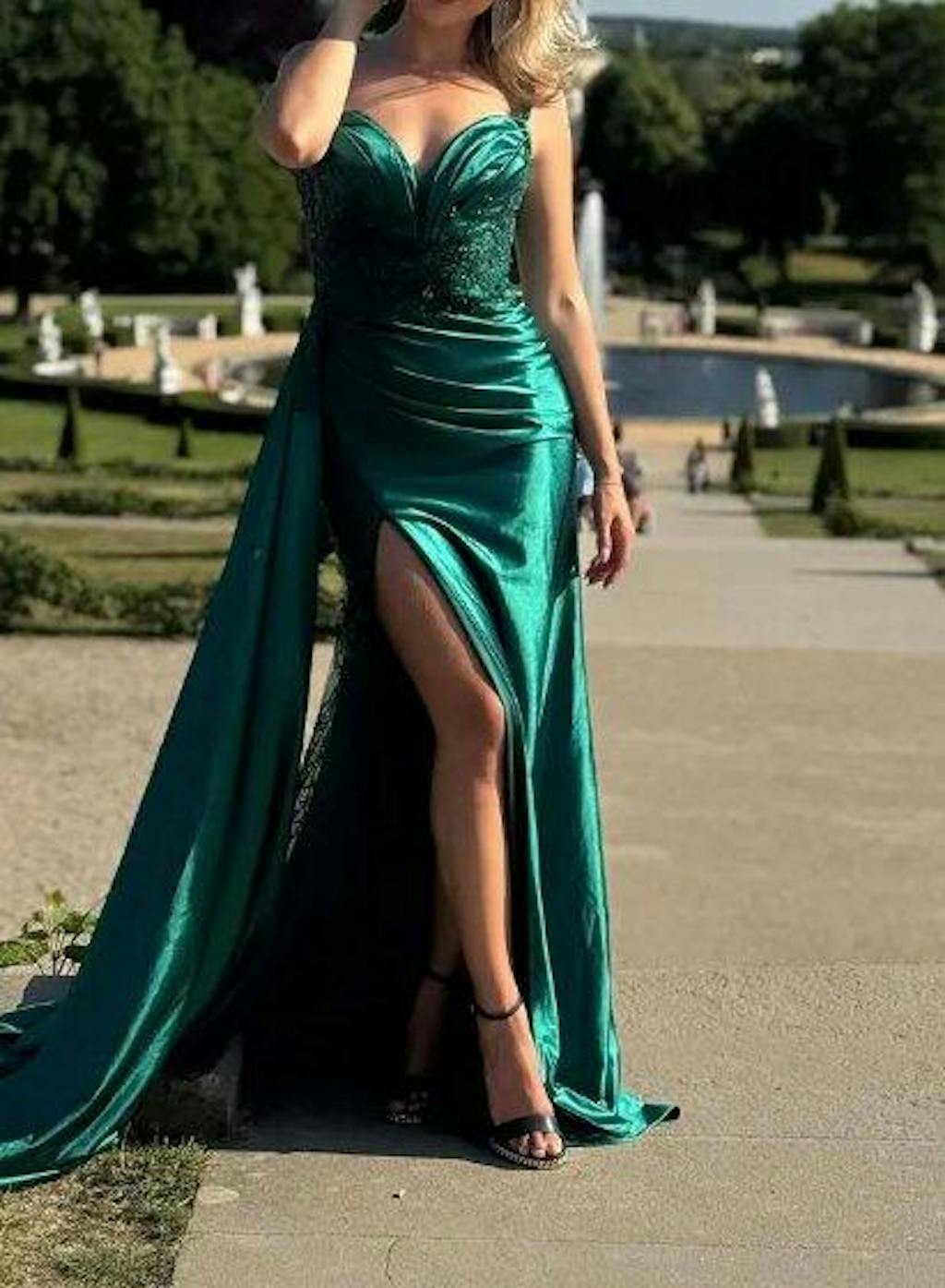 Dark Green Mermaid V-Neck Satin Appliqued Sequin Long Prom Dress with Slit
