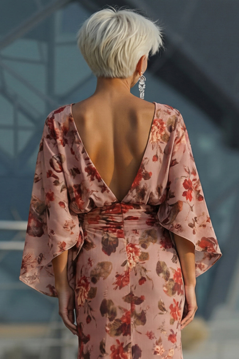 Dusty Rose Floral Chiffon Sheath Maxi Mother of the Bride Dress with Cape Sleeves