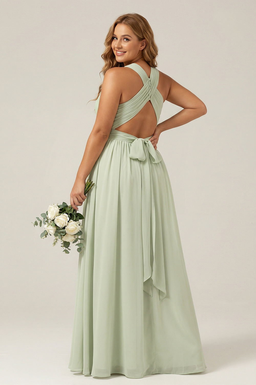 Dusty Sage Halter Plus Size A Line Chiffon Ruched Long Bridesmaid Dress