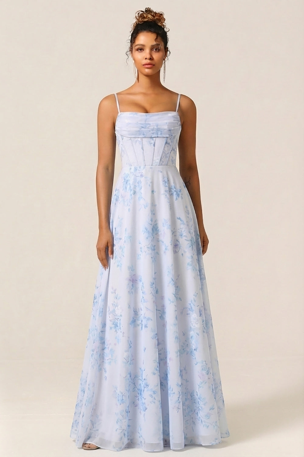 Floral Blue Corset A Line Long Bridesmaid Dress