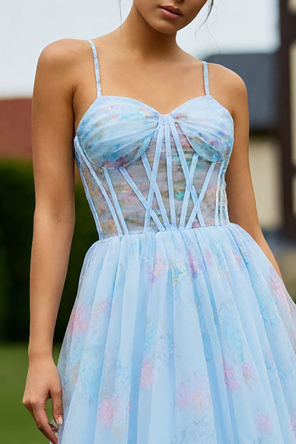 Floral Blue Corset Tulle Spaghetti Straps A Line Long Prom Dress With Slit