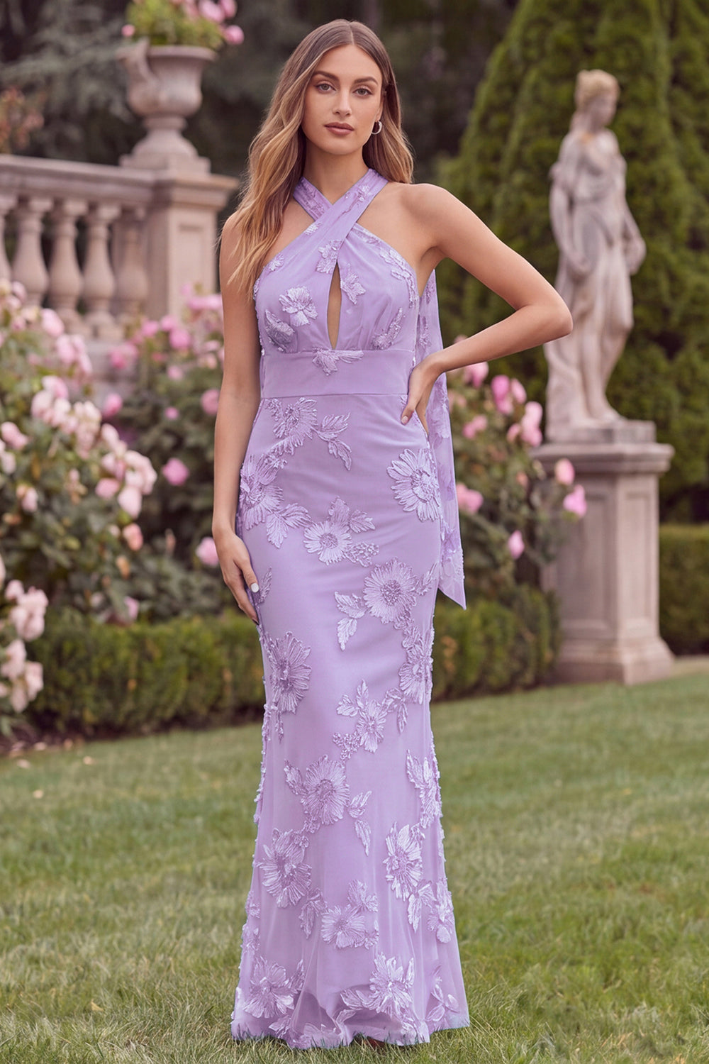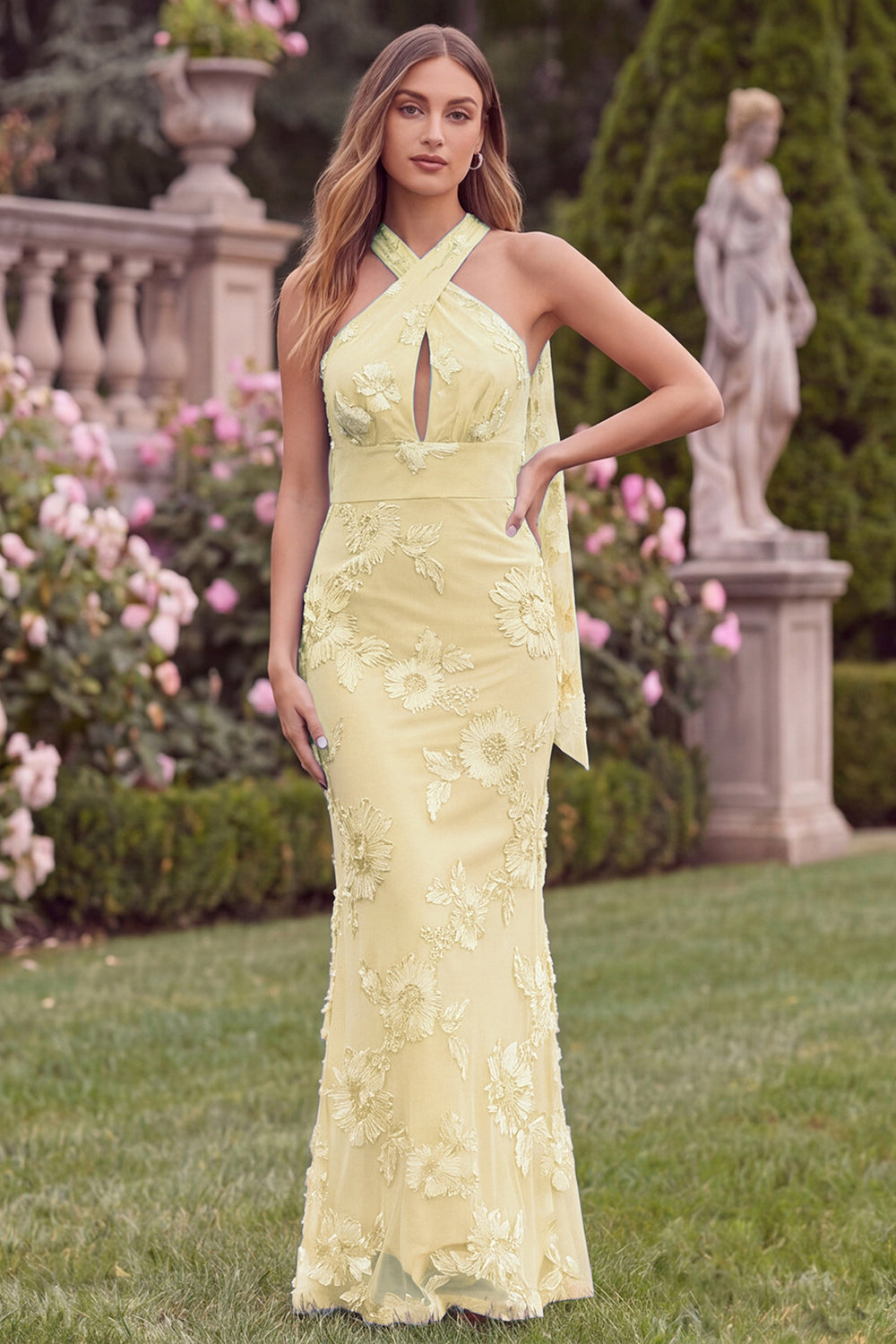 Floral Halter Daffodil Mermaid Wedding Guest Dress with Scarf