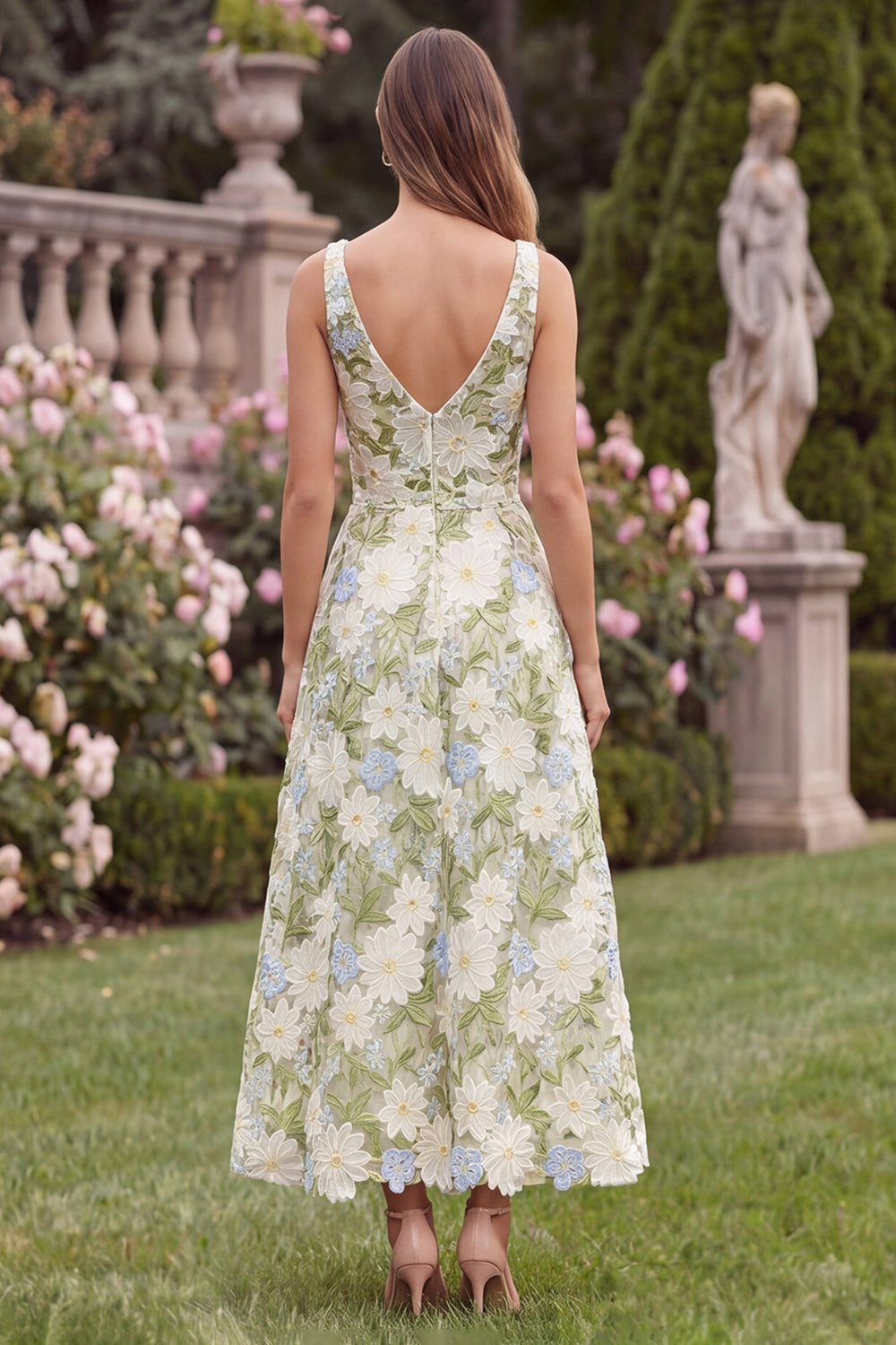 Floral V-Neck A Line Sage Wedding Guest Dress