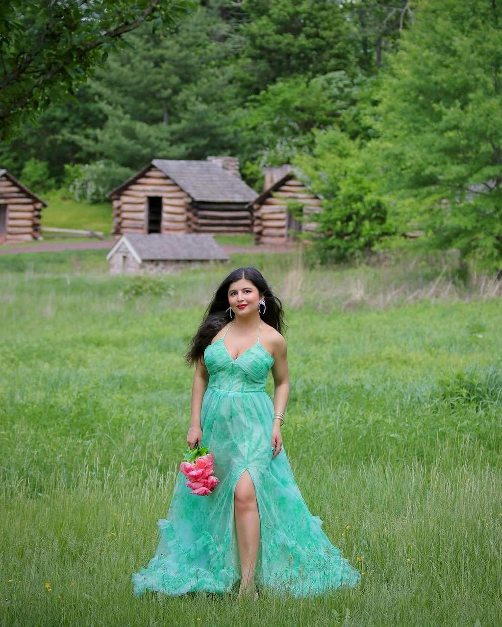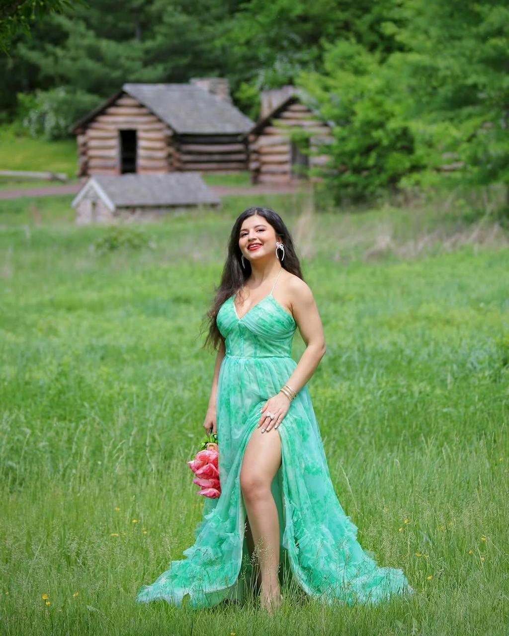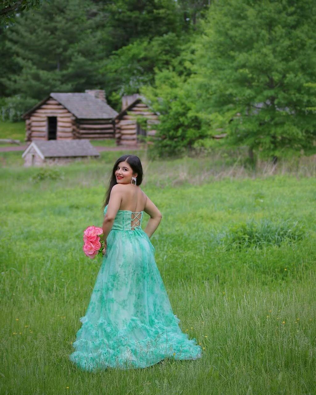Green A-Line Halter Floral Corset Ruffled Long Prom Dress with Slit