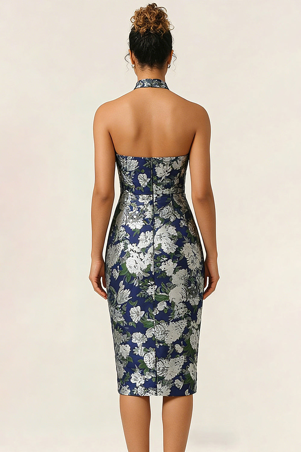 Halter Sheath Navy Flower Midi Wedding Guest Dress