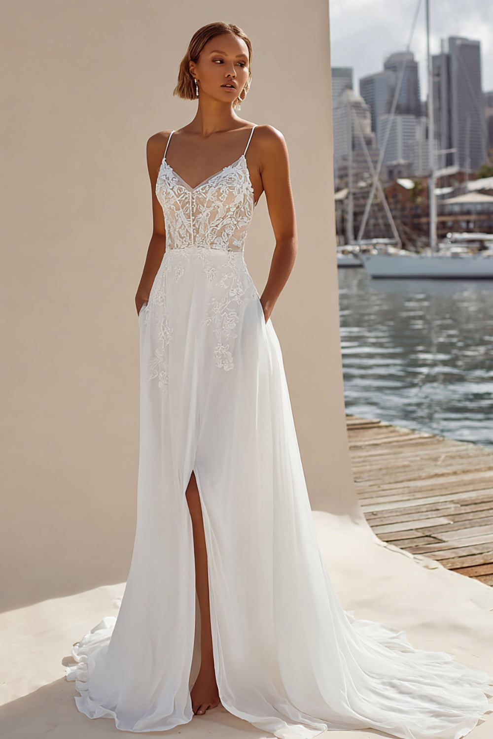 Ivory Lace Appliqued A Line Spaghetti Straps Long Wedding Dress with Slit