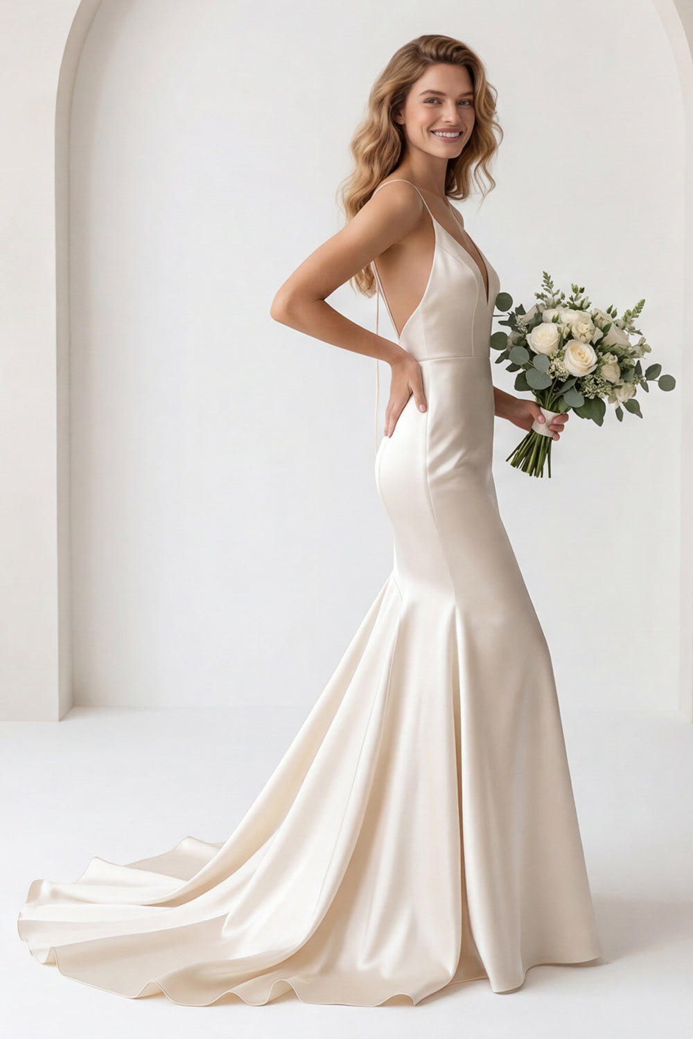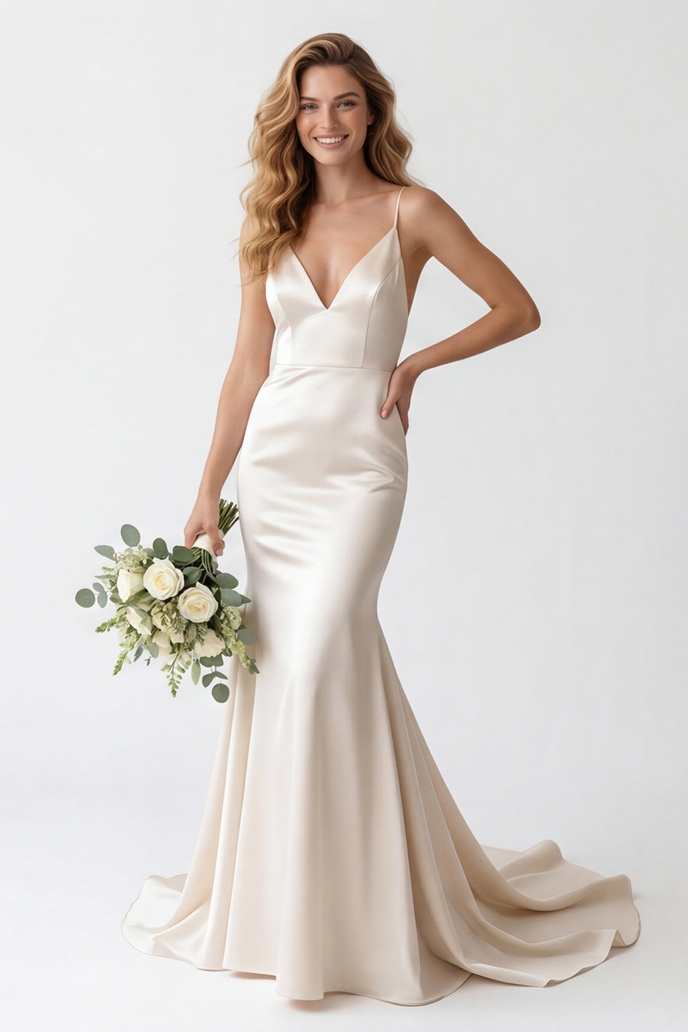 Ivory Mermaid Satin Spaghetti Straps Long Wedding Dress