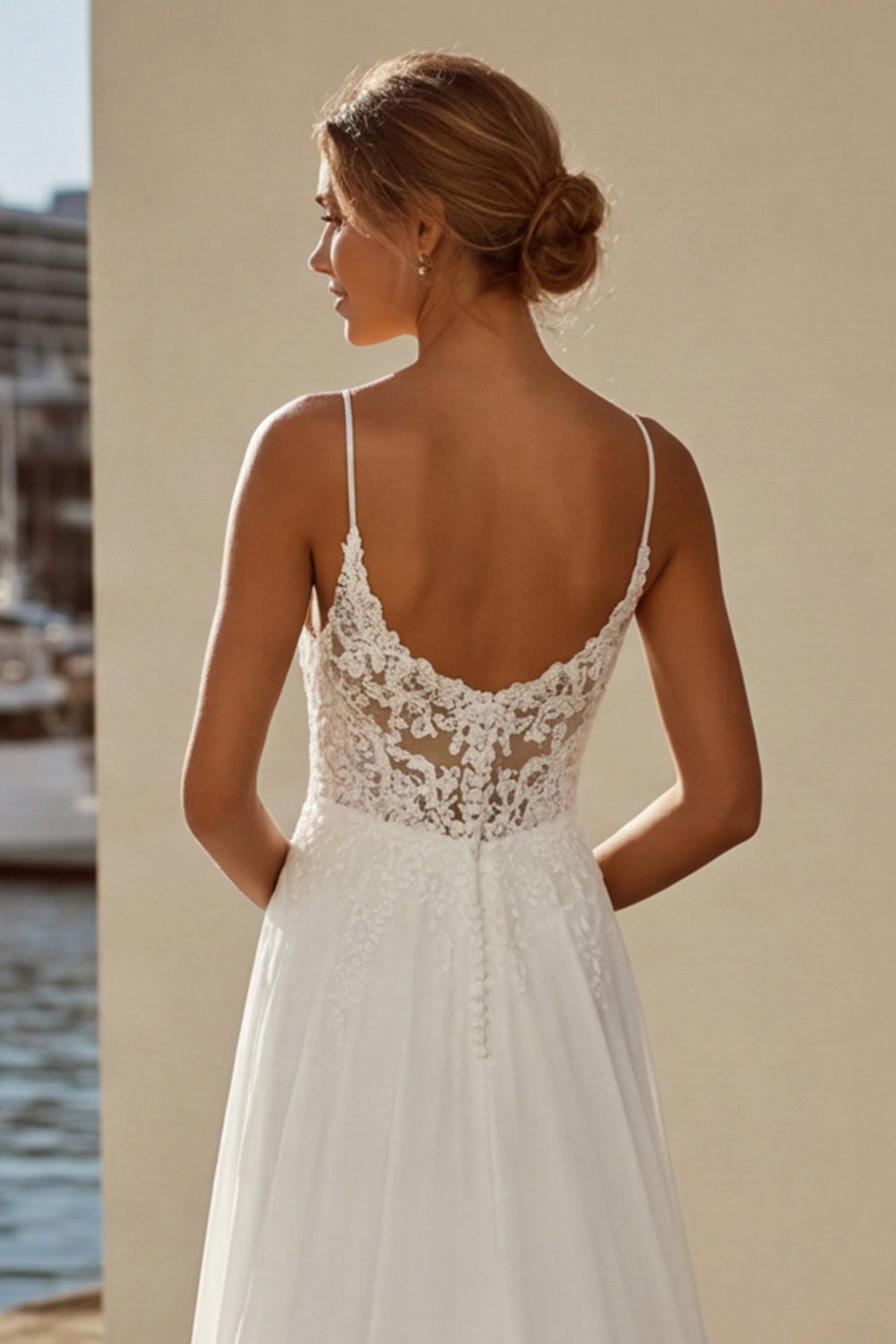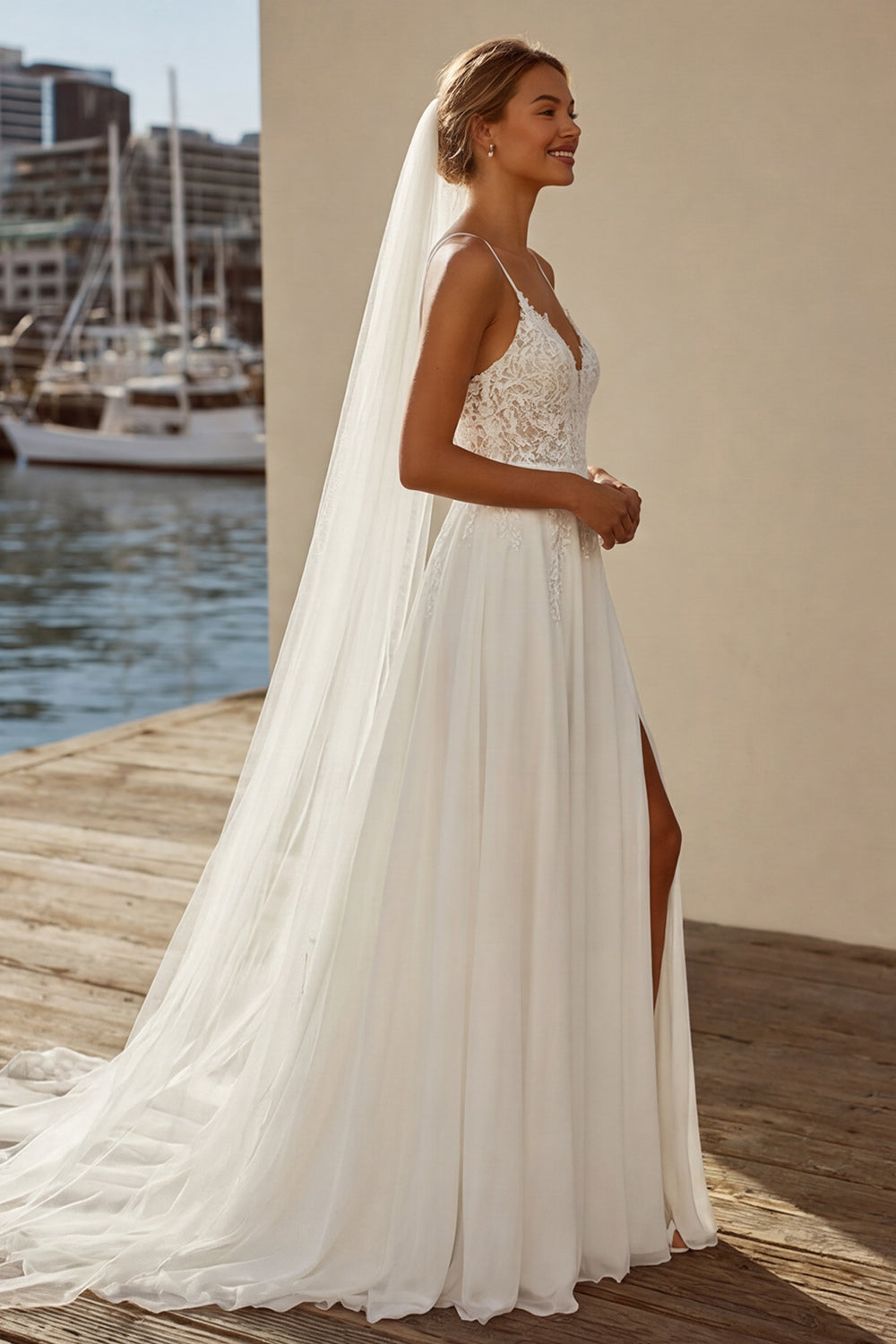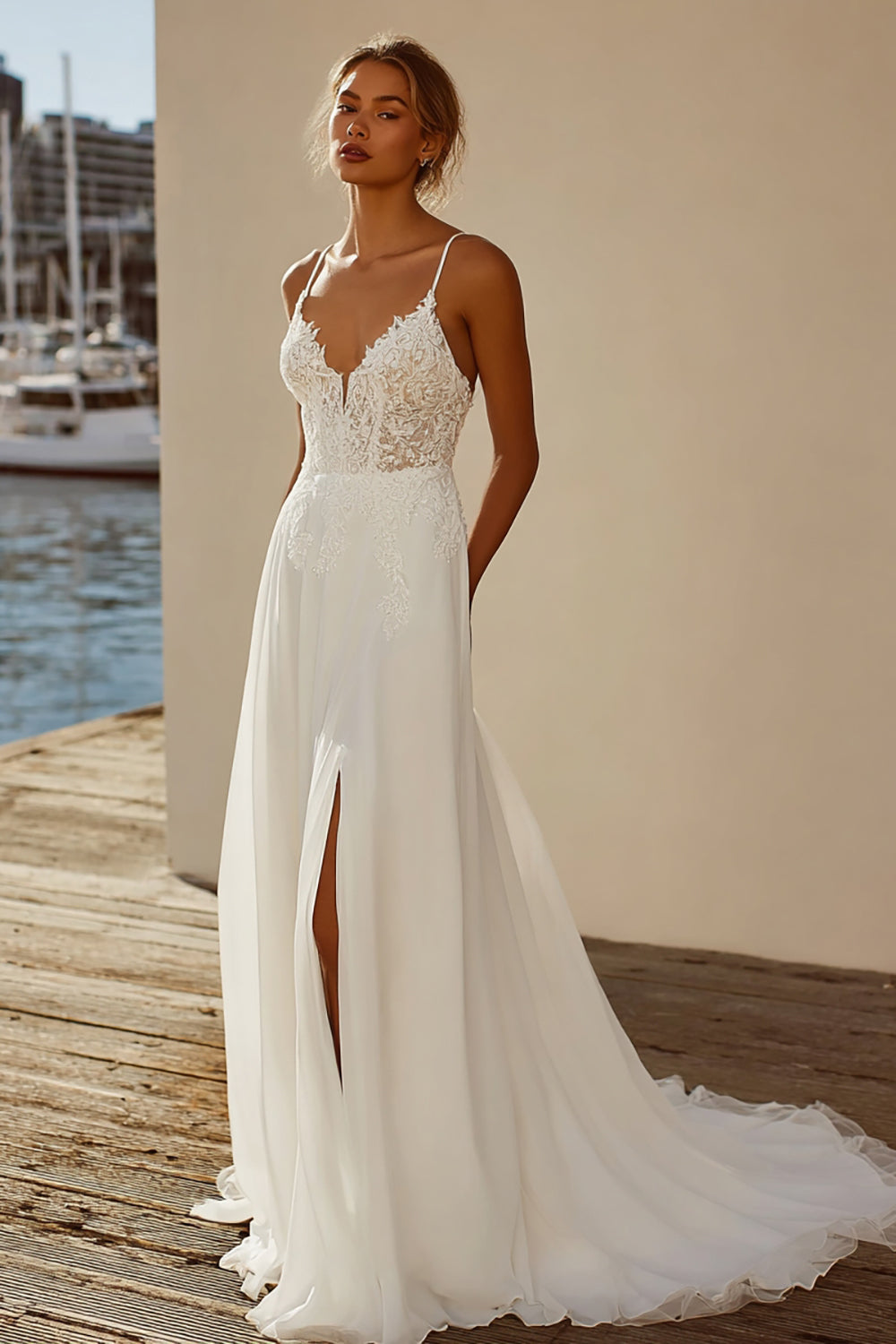 Ivory Spaghetti Straps A Line Appliqued Long Wedding Dress with Slit