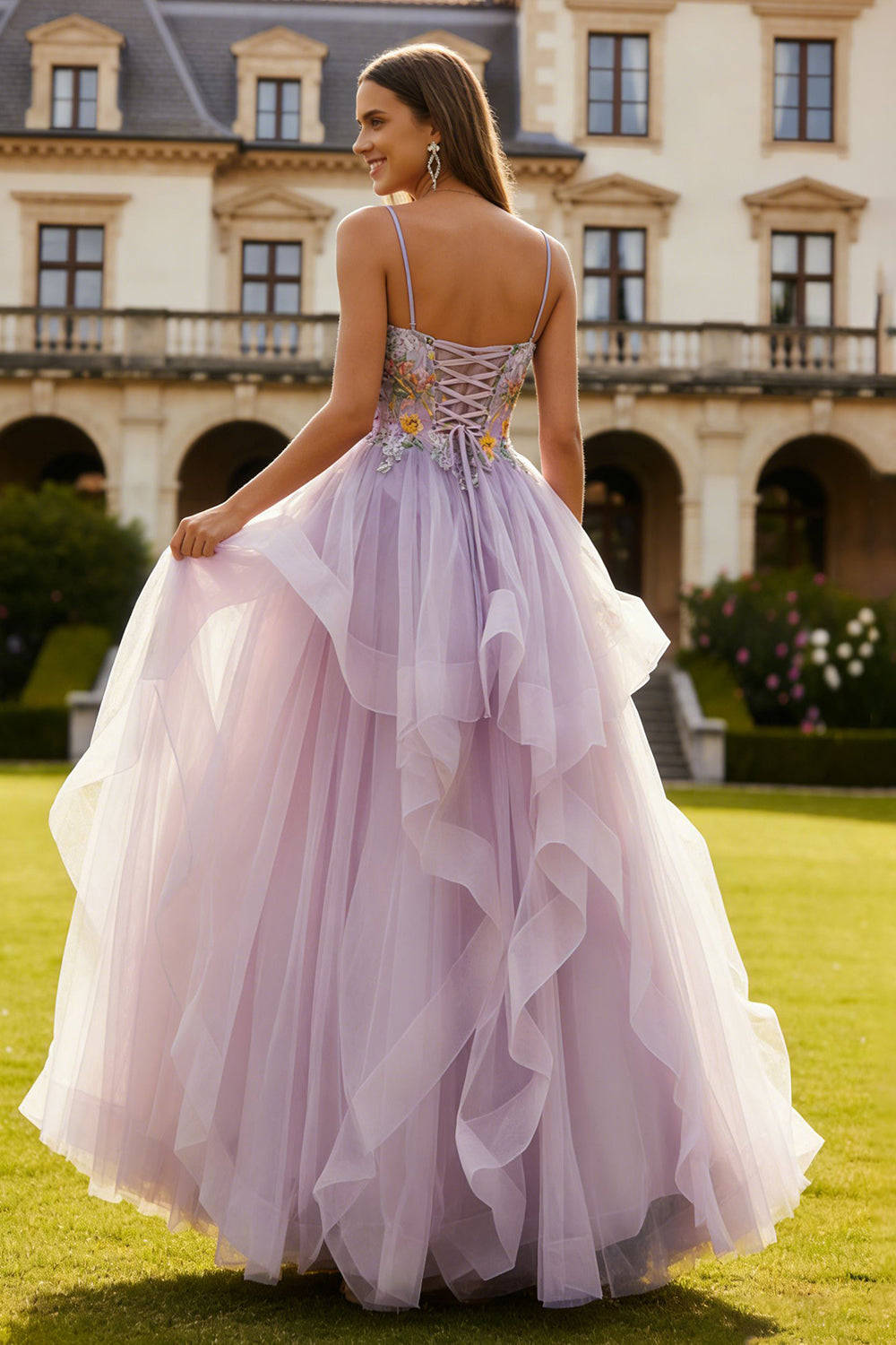 Lilac A Line Floral Spaghetti Straps Tulle Long Prom Dress with Ruffles