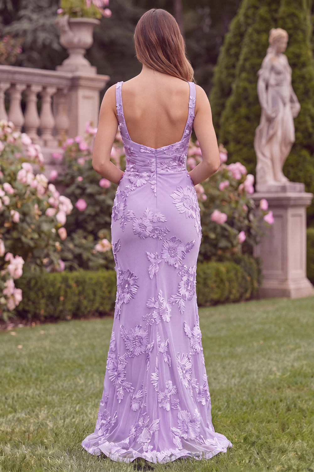 Lilac Floral Square Neck Mermaid Wedding Guest Dress with Scarf