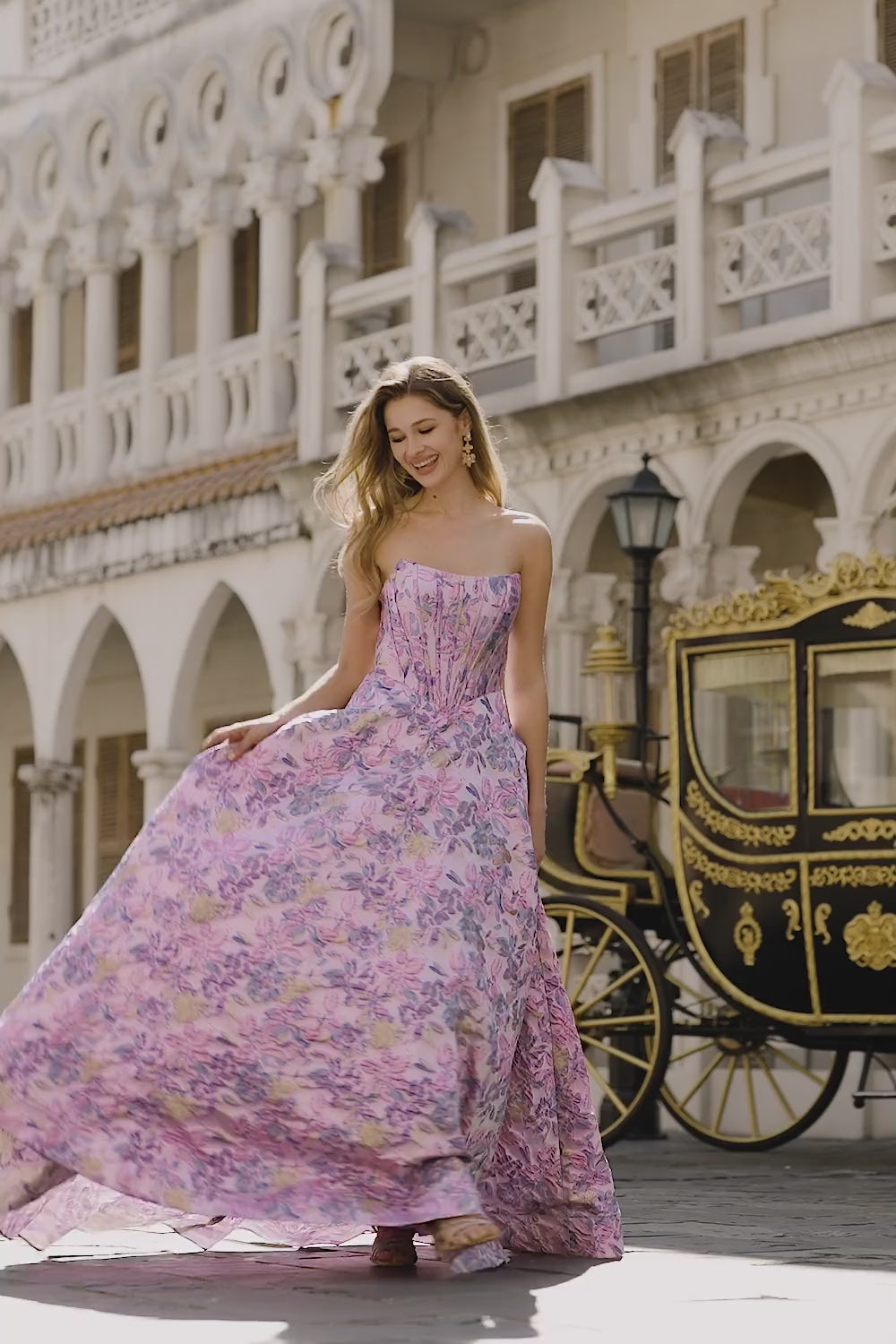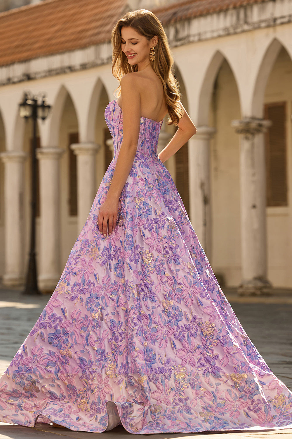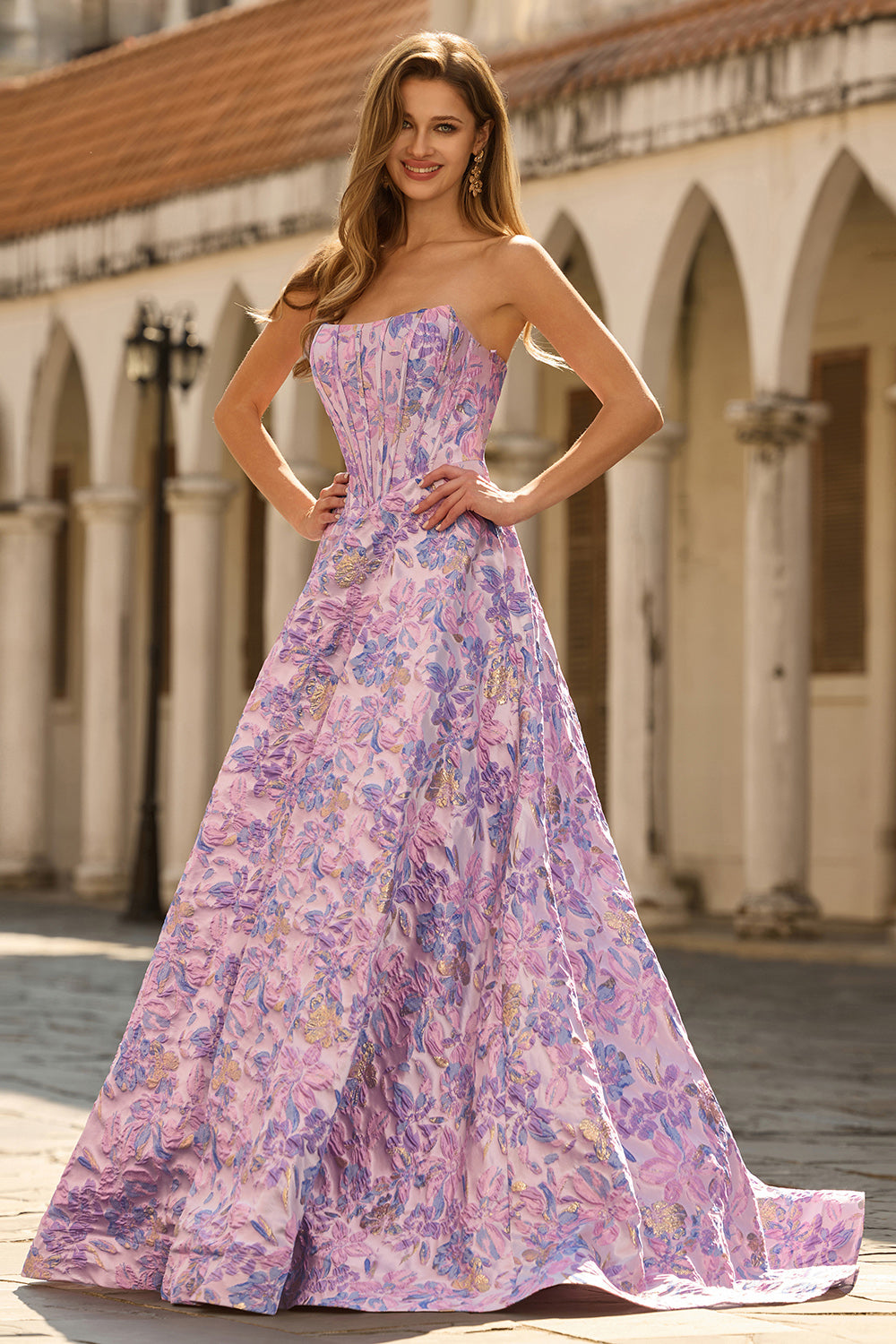 Lilac Jacquard Floral Corset Strapless A Line Long Prom Dress