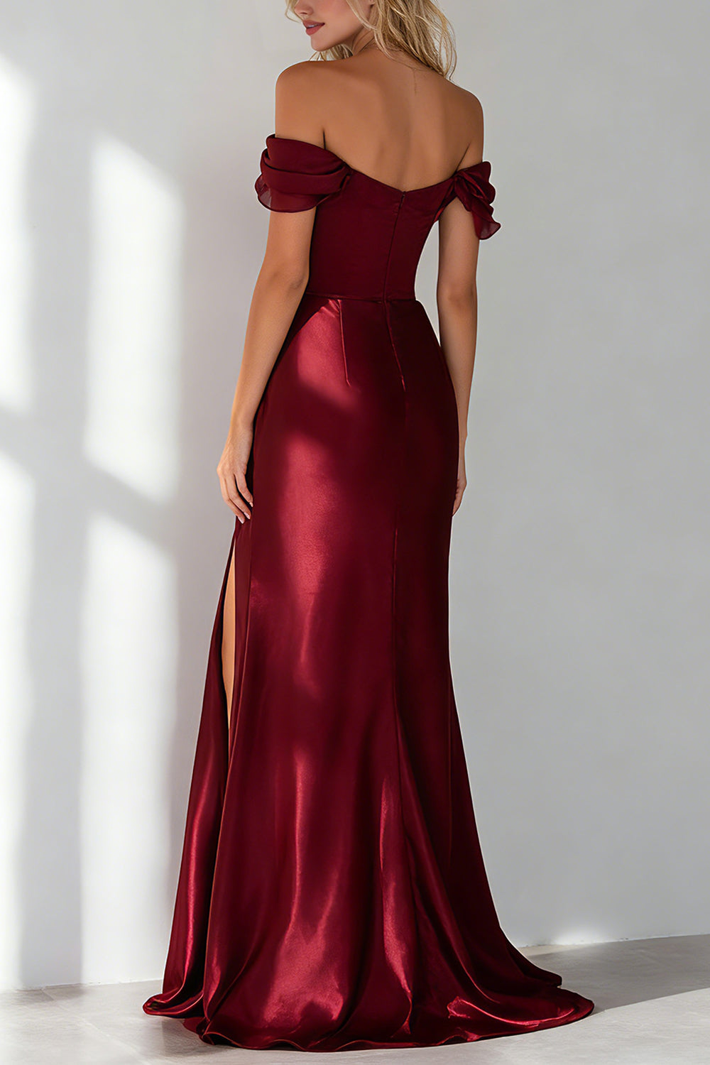 Mermaid Burgundy Off the Shoulder Satin Long Wedding Guest Dress With Slit