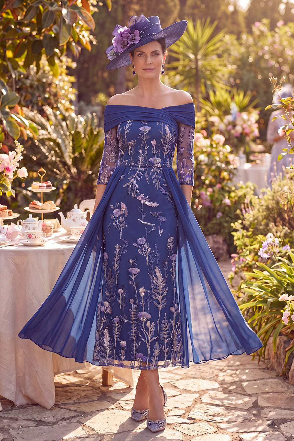 Navy Sheath Floral Off the Shoulder Midi Mum of the Bride Dress with Side Streamer
