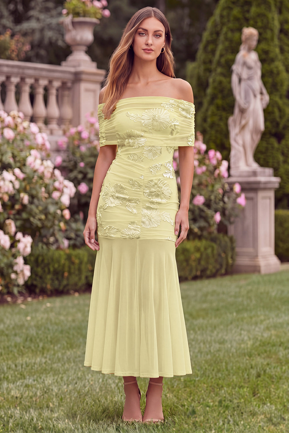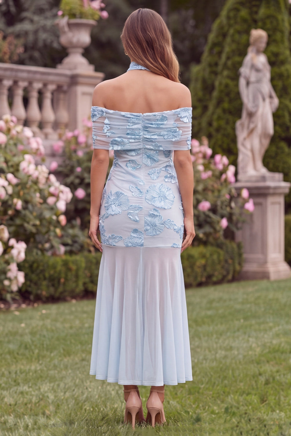 Off the Shoulder Baby Blue Mermaid Floral Wedding Guest Dress
