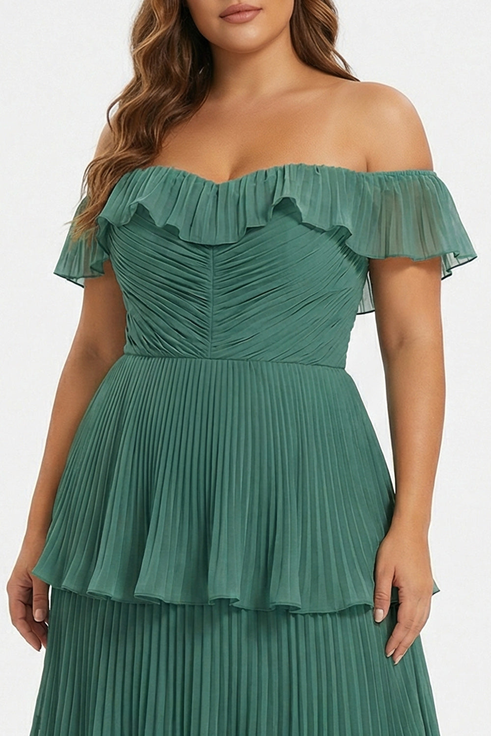 Off the Shoulder Eucalyptus Tiered Pleated Chiffon Plus Size Long Bridesmaid Dress with Ruffles