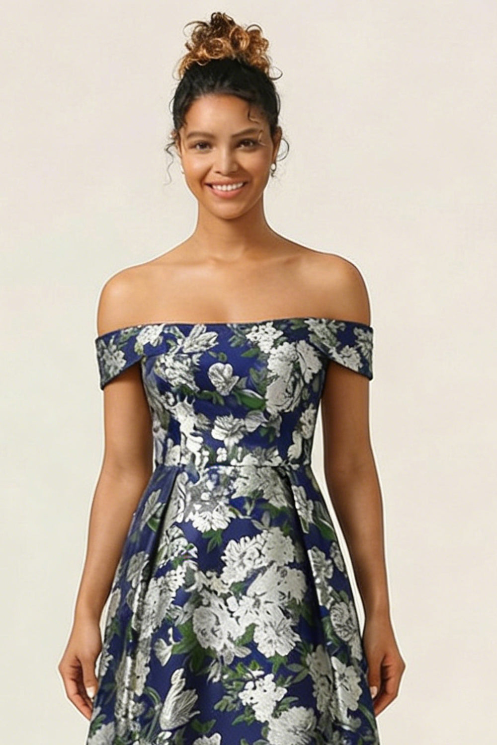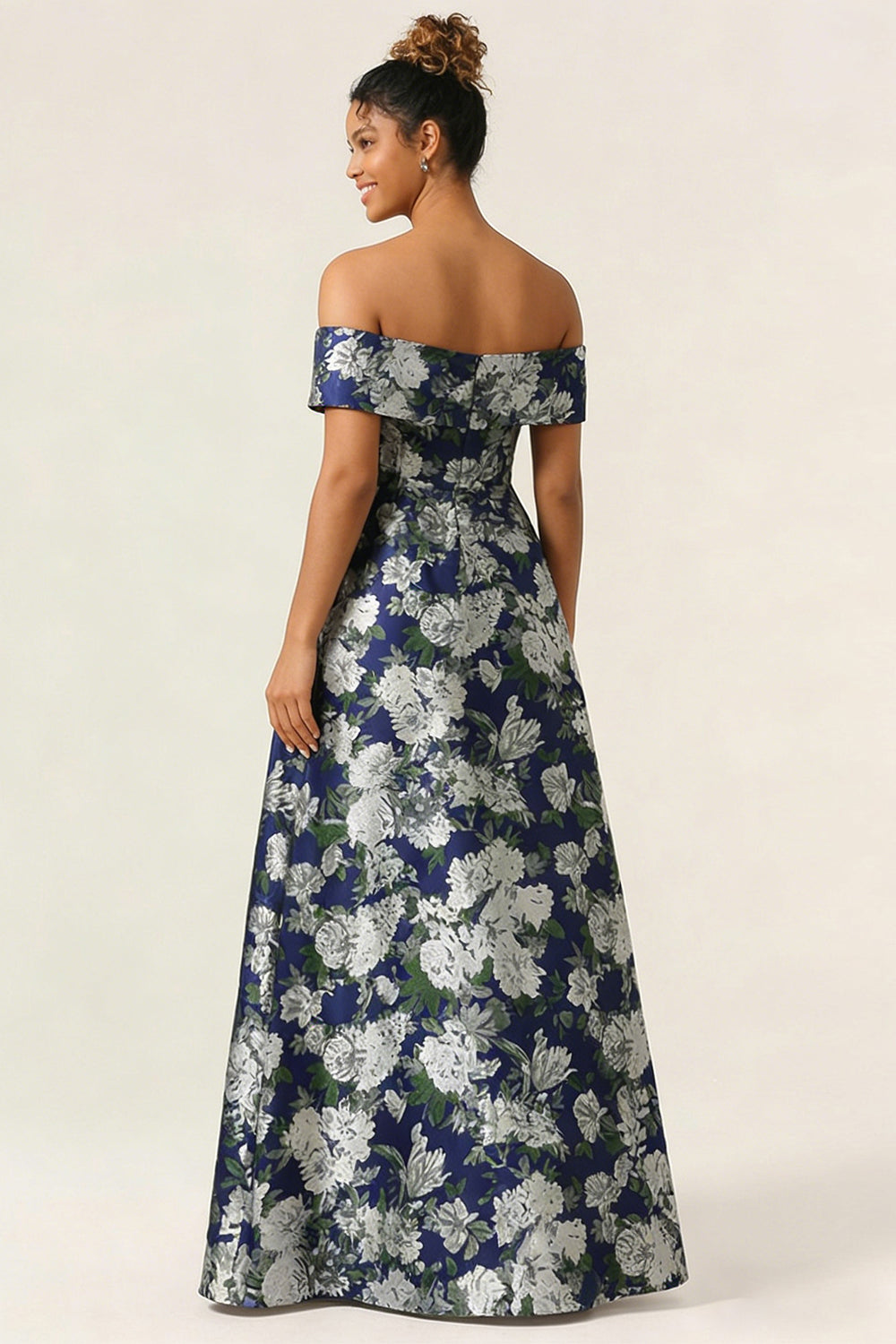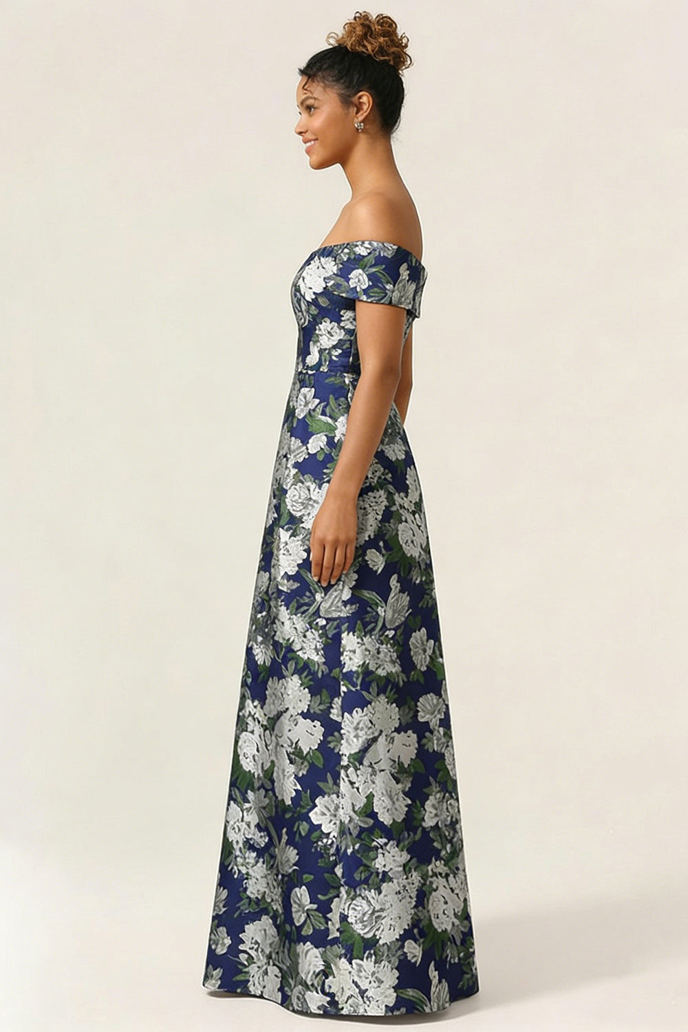 Off the Shoulder Navy Flower A Line Long Wedding Guest Dress