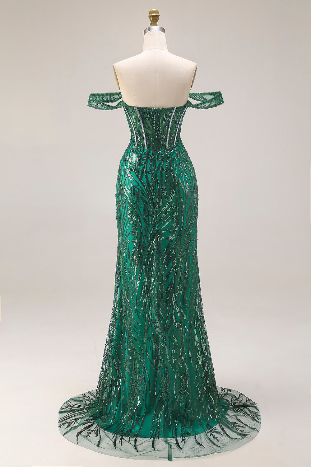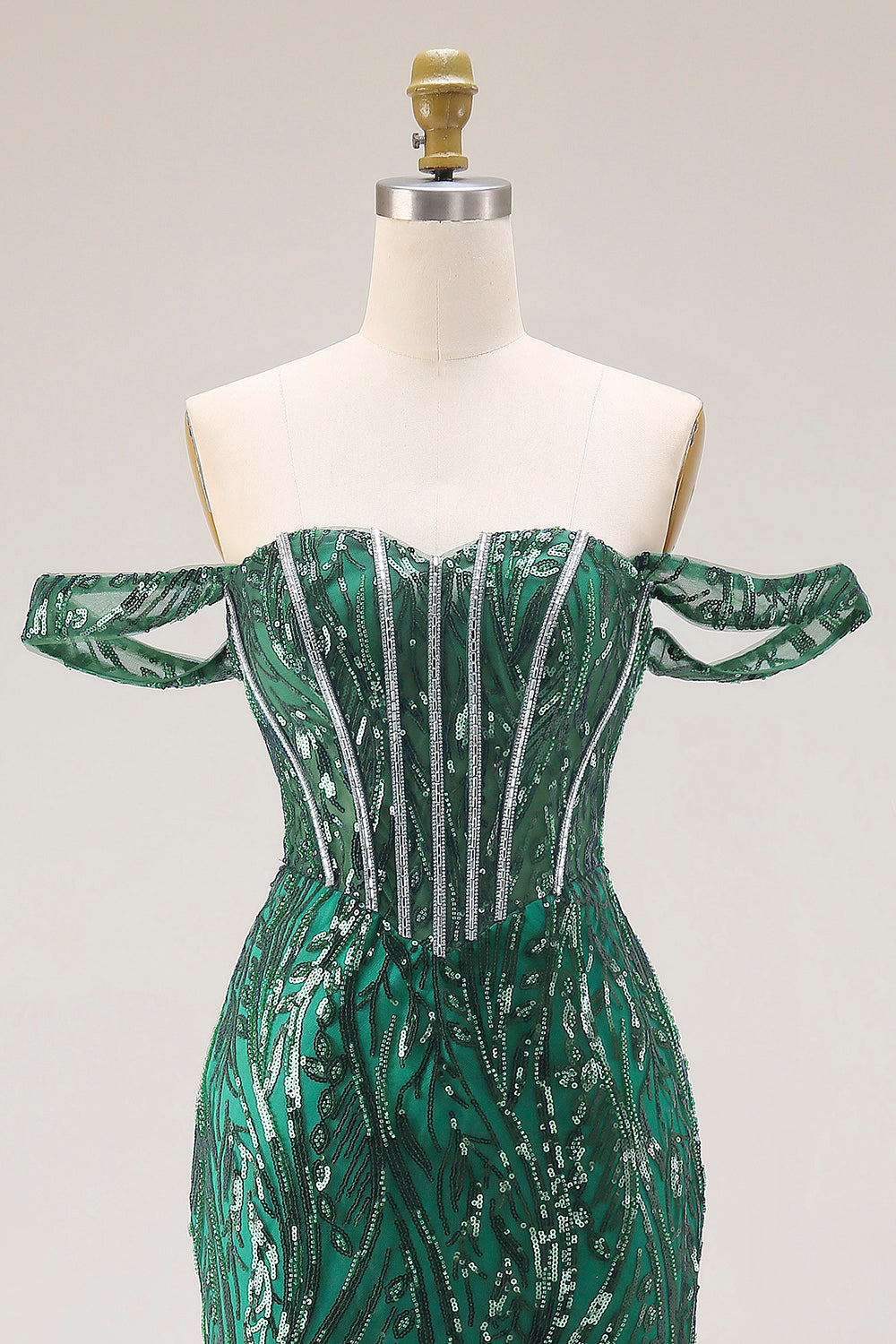 Off the Shoulder Sequined Dark Green Beaded Corset Mermaid Long Prom Dress