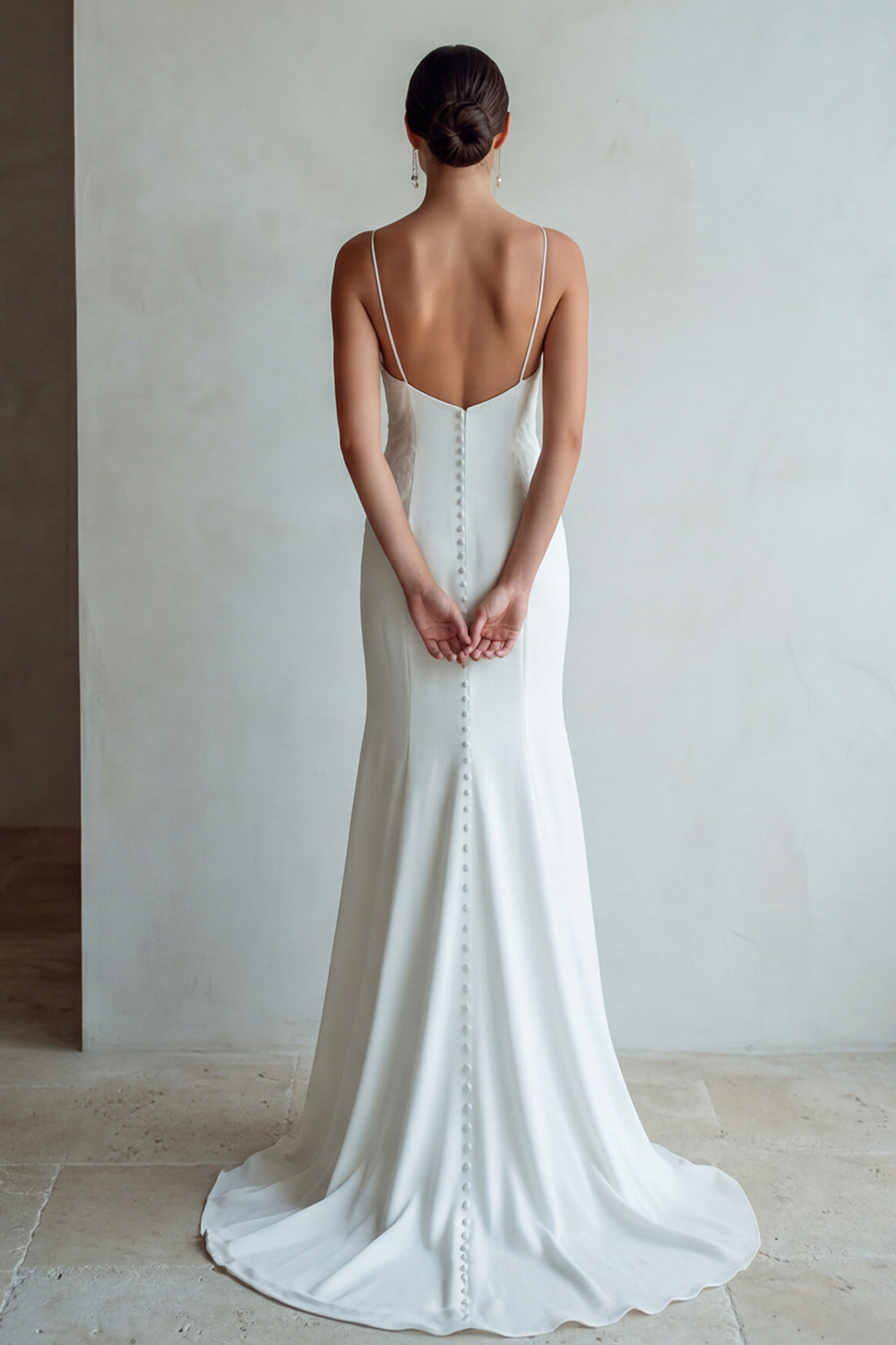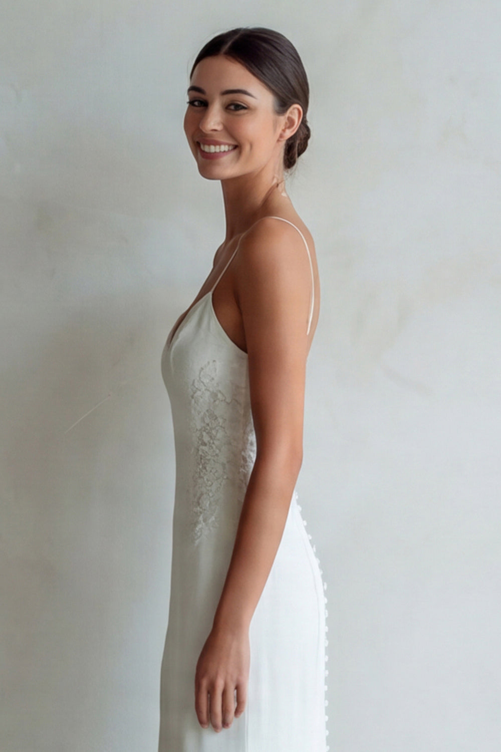 Simple Ivory Sheath Spaghetti Straps Satin Wedding Dress with Sweep Train