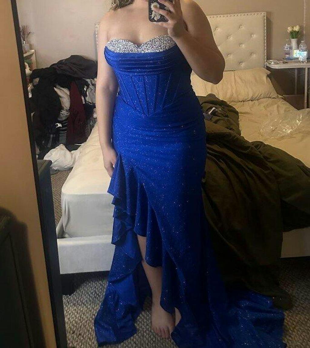 Sparkly Grey Blue Mermaid Ruffled Corset Strapless Satin Long Prom Dress with Slit