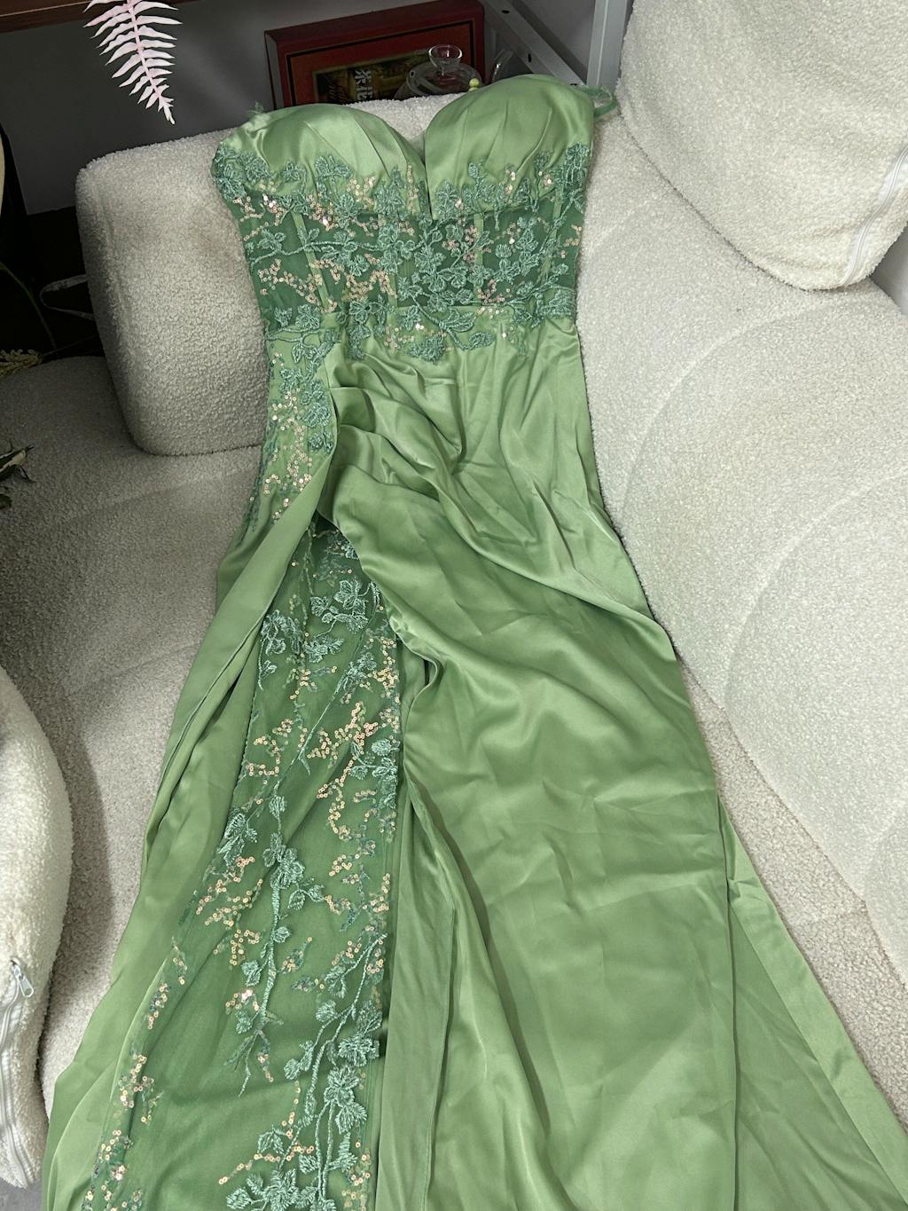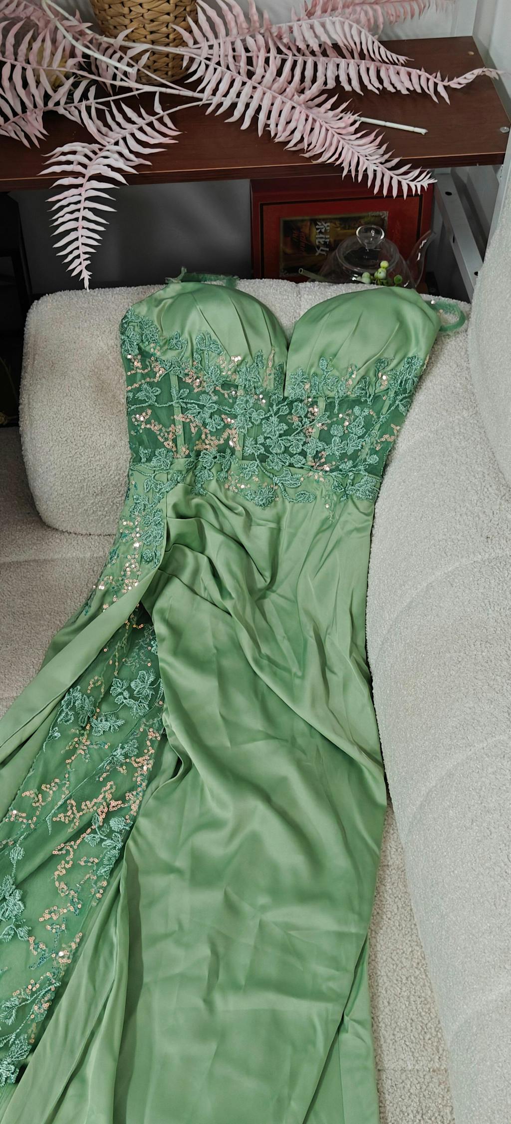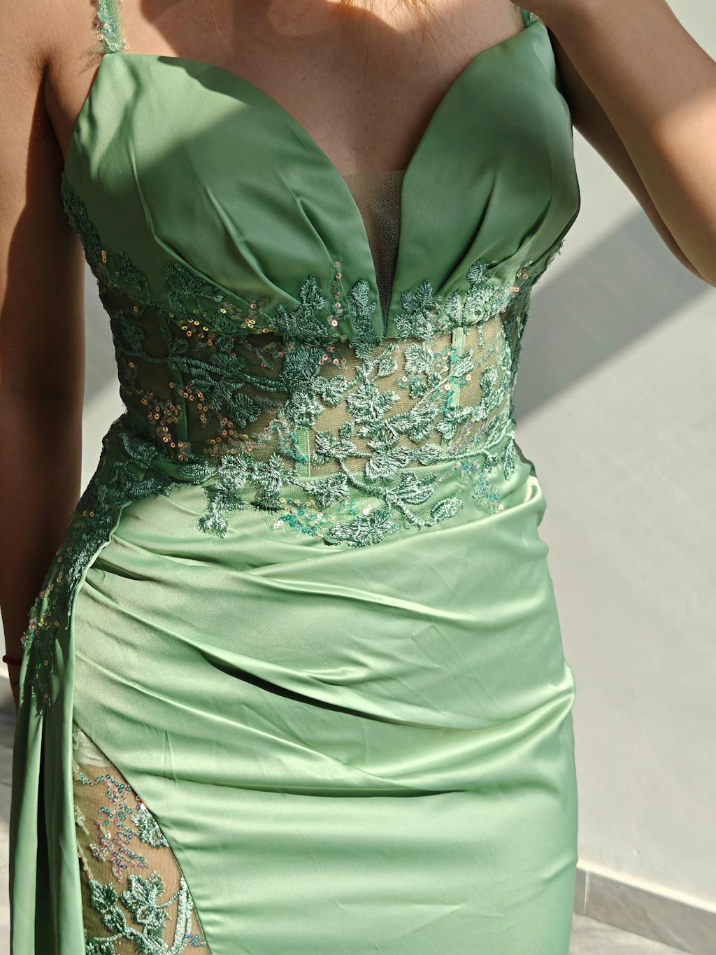 Sparkly Light Green Mermaid Appliqued Long Prom Dress with Slit