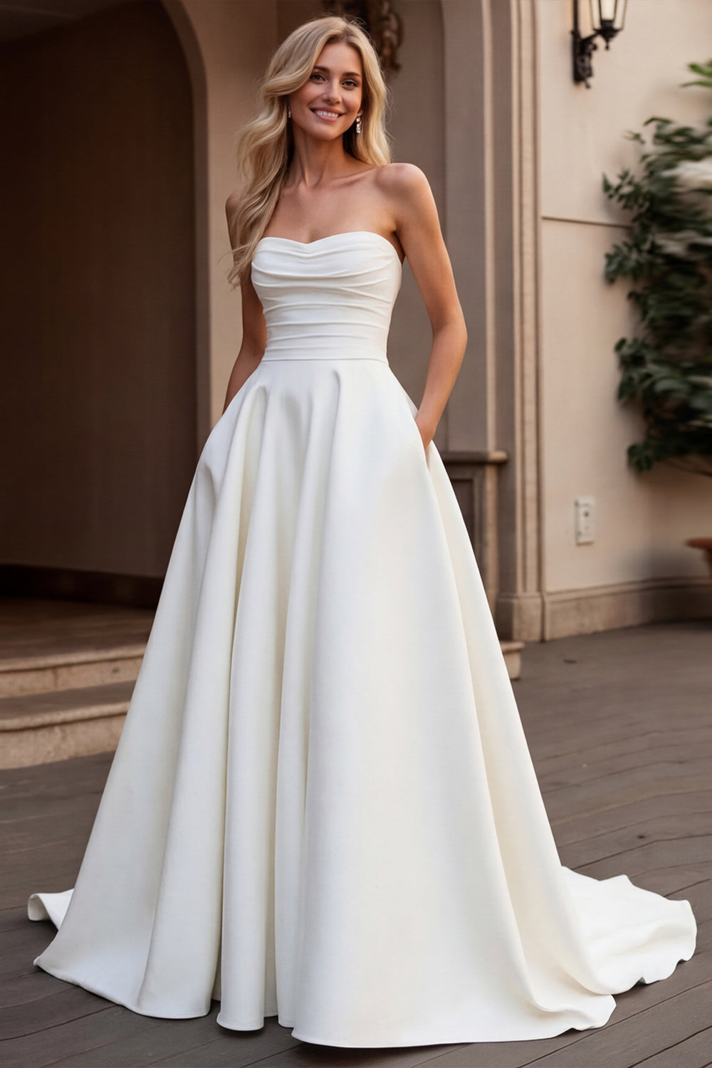 Strapless A Line Ivory Satin Ruched Wedding Dress