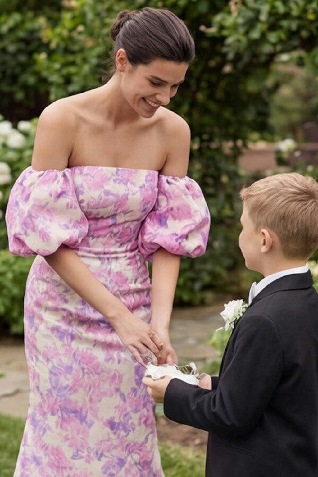 I wore this to my cousin’s garden wedding, and it was just delightful. The puffed off-the-shoulder sleeves added a whimsical touch, and the pink and purple floral print really popped against the lush greenery.