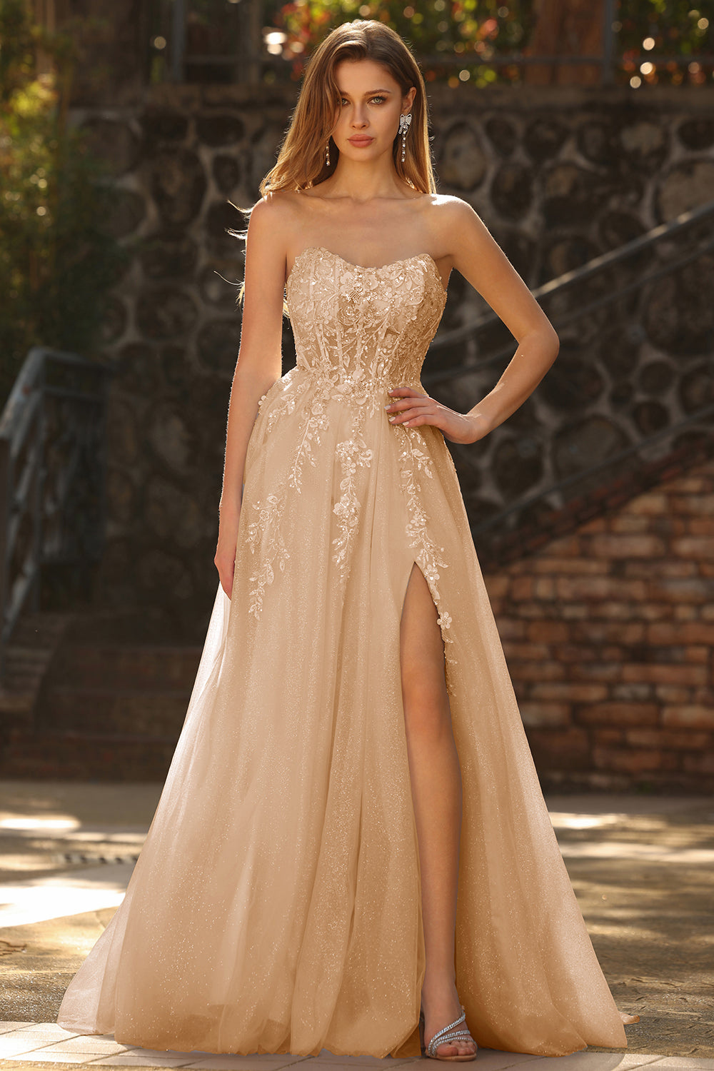 Glitter Strapless Champagne Corset A Line Appliqued Prom Dress with Slit