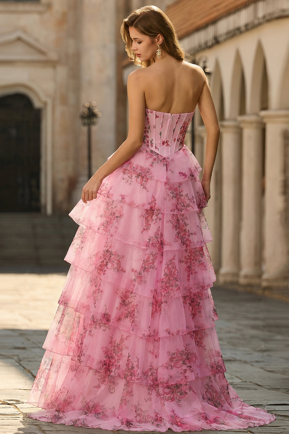 Sweetheart Blush Floral A Line Corset Tulle Tiered Long Prom Dress with Ruffles