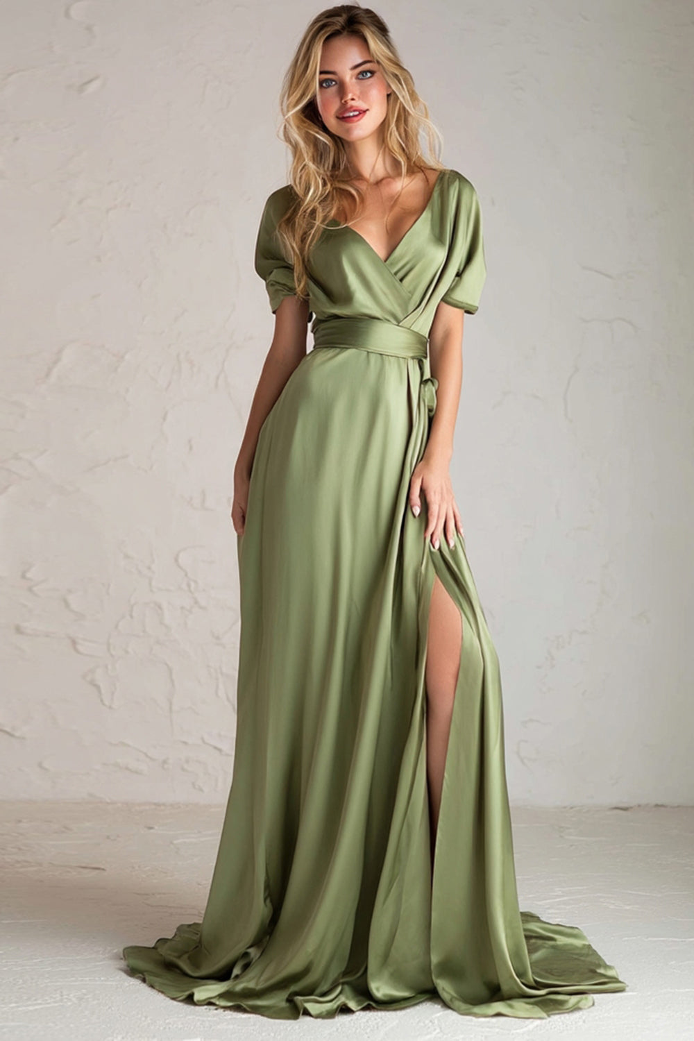 V-Neck Sage Green A Line Short Sleeves Long Bridesmaid Dress With Slit