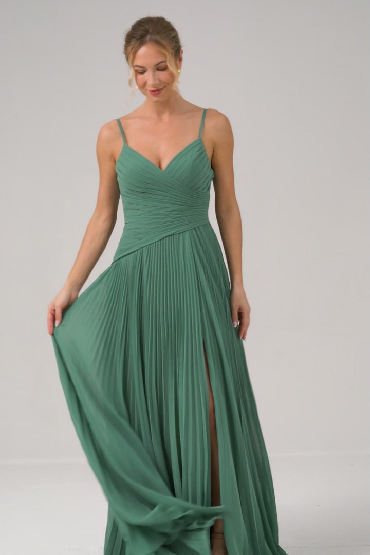 A Line Spaghetti Straps Pleated Chiffon Long Bridesmaid Dress with Slit