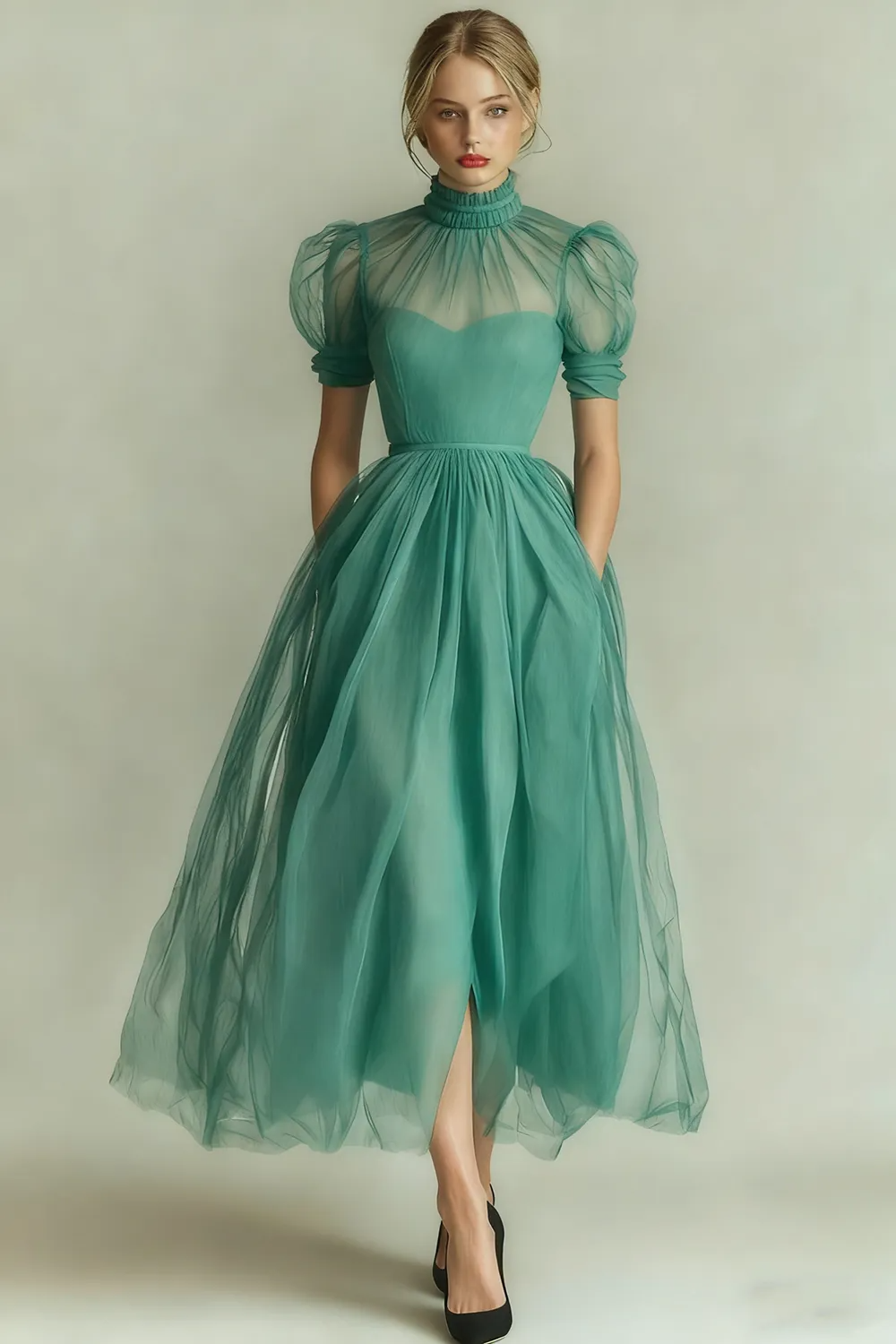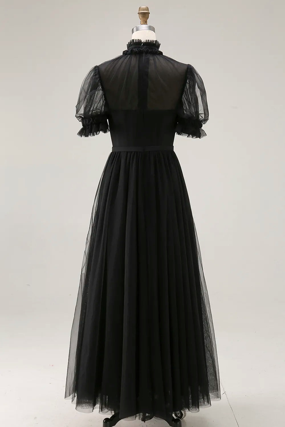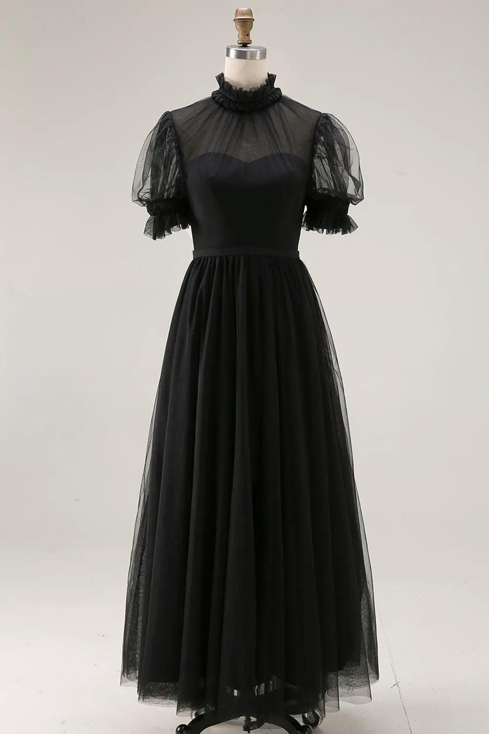 High Neck A Line Short Sleeve Little Black Dress with Slit