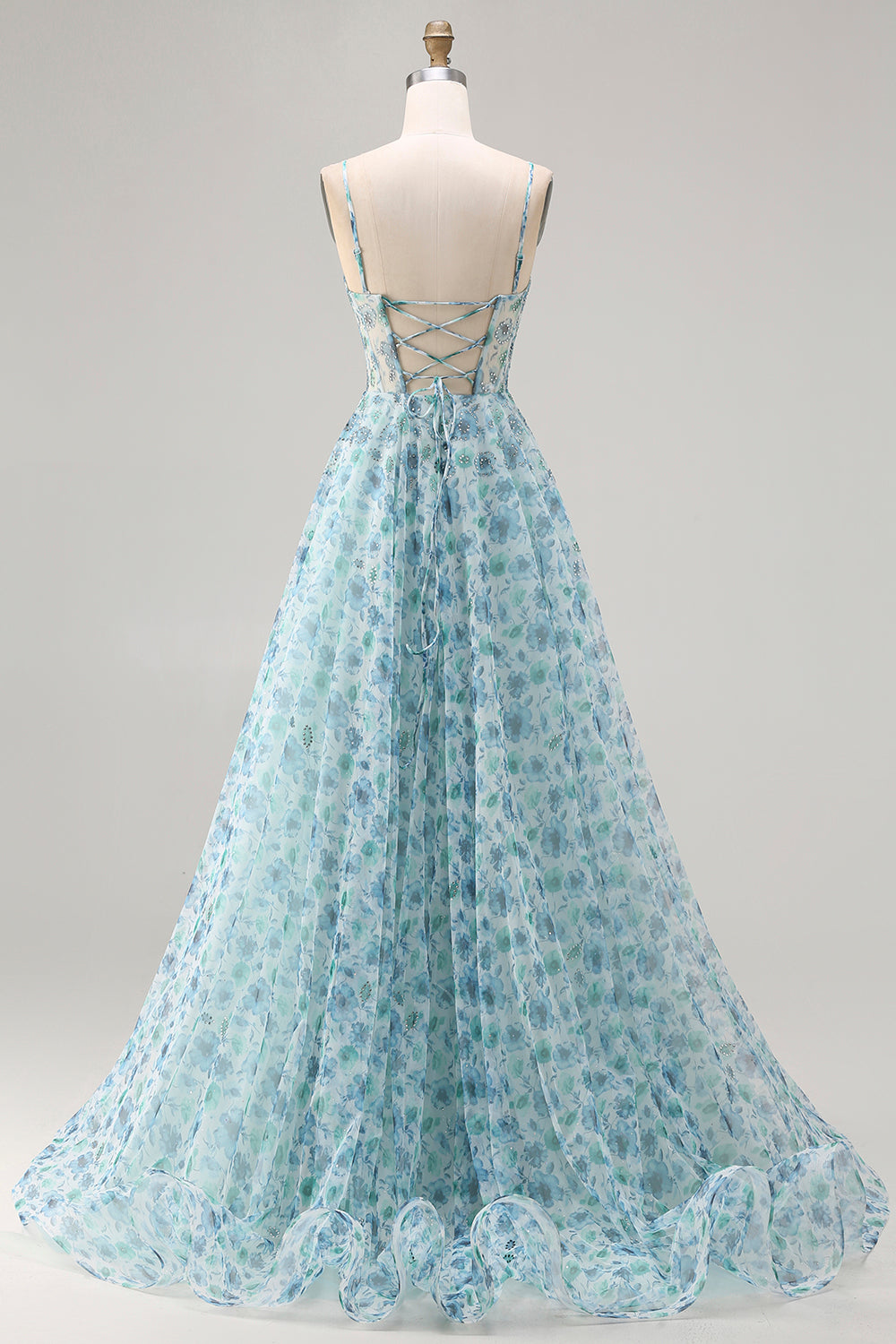 Blue Floral Strapless A Line Corset Beaded Prom Dress