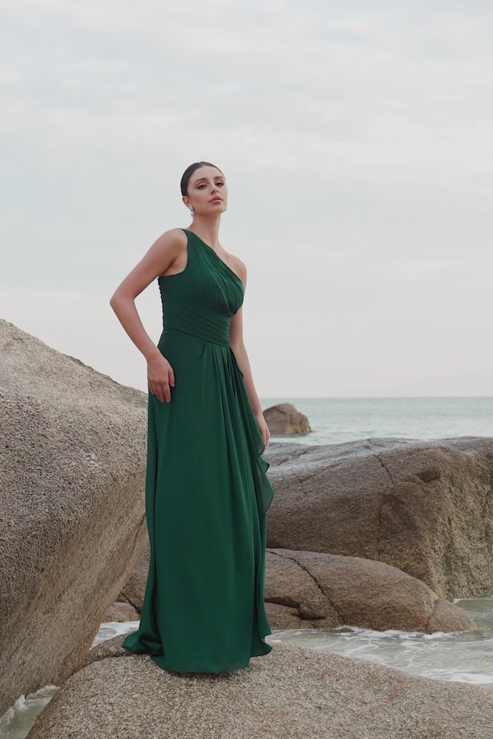 Dark Green One Shoulder Chiffon Pleated A-Line Maxi Dress